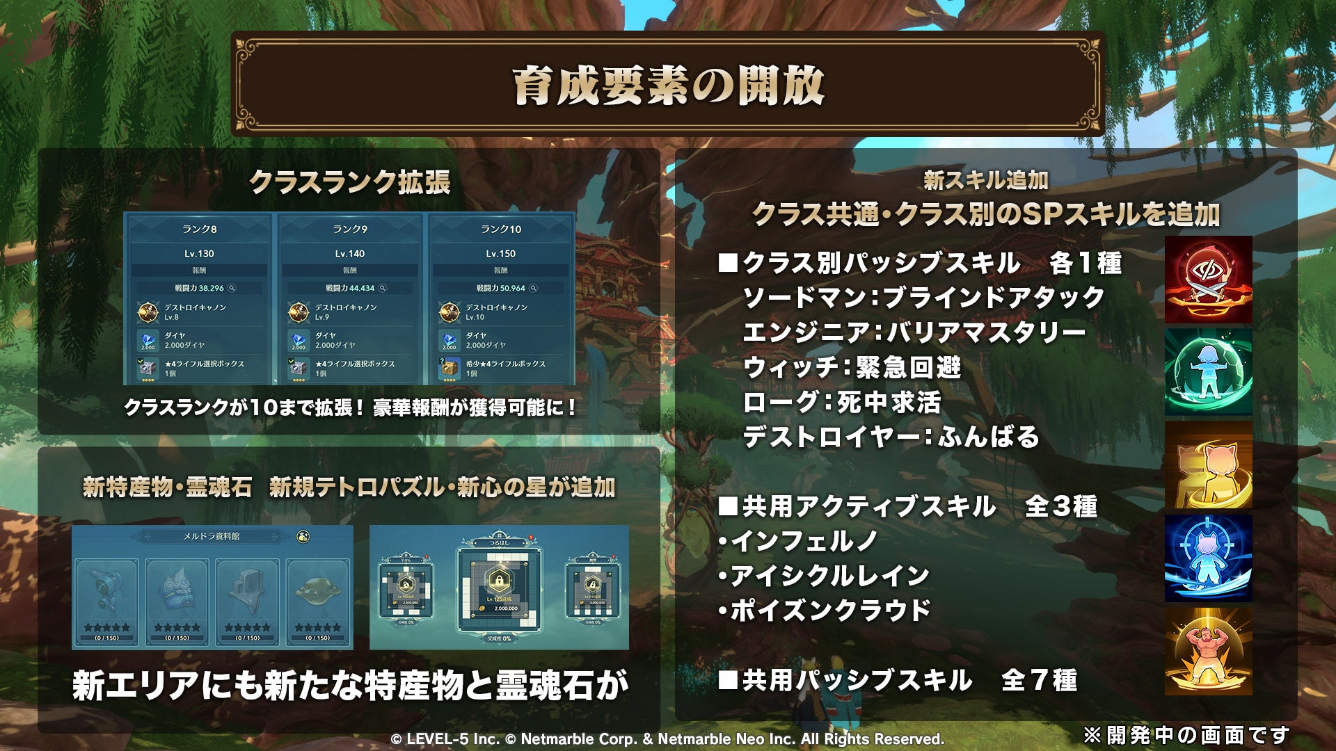 また、キャラクターの育成要素となる「心の星」と「テトロパズル」に、新たに3つの心と5つのパズルのページを追加いたしました。さらに、クラス共通のスペシャルアクティブスキル3種と、クラス別各1種・クラス共通7種のスペシャルパッシブスキルを新たに追加いたしました。