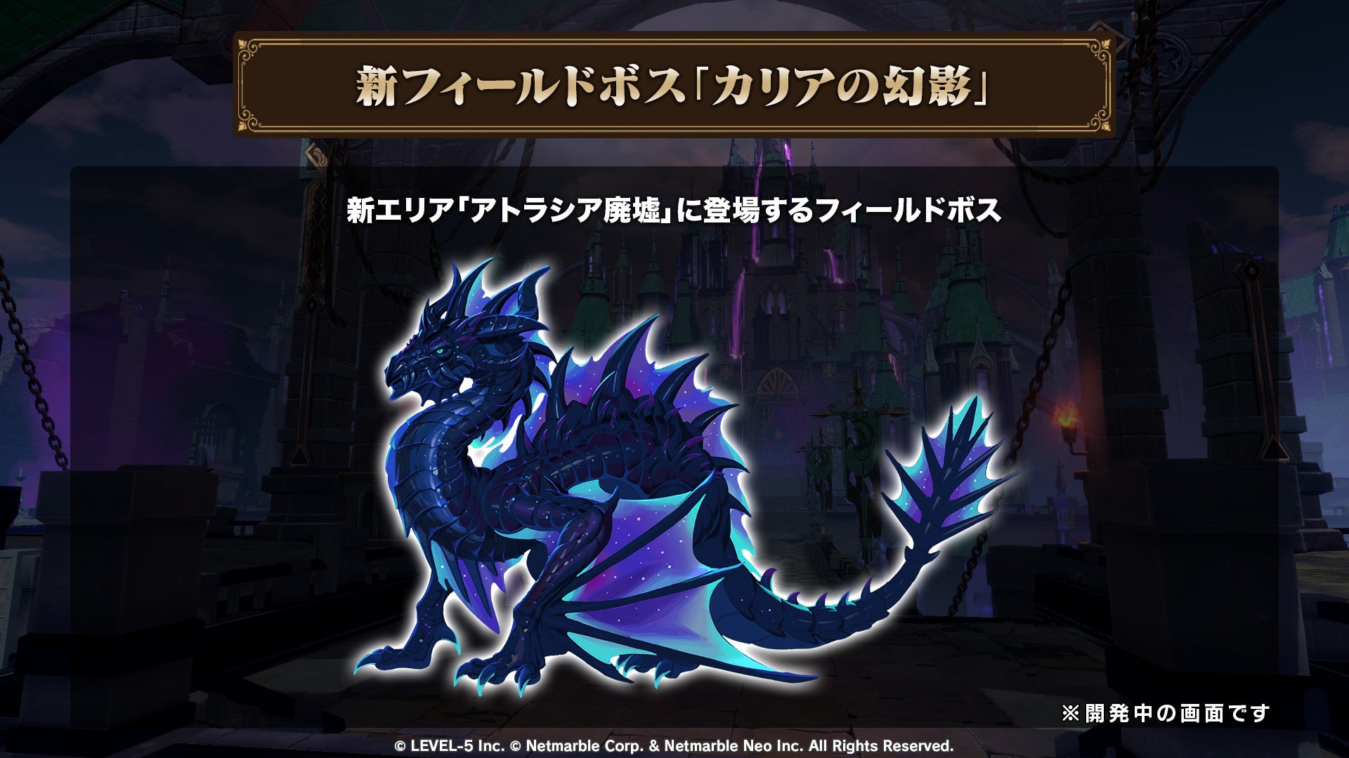 さらに、「アトラシア廃墟」のフィールドボス「カリアの幻影」が新たに登場いたします。「カリアの幻影」は闇属性の守護龍で、暗闇が込められた電流の魔法を使用します。プレイヤーの力を合わせて討伐に挑戦してください。