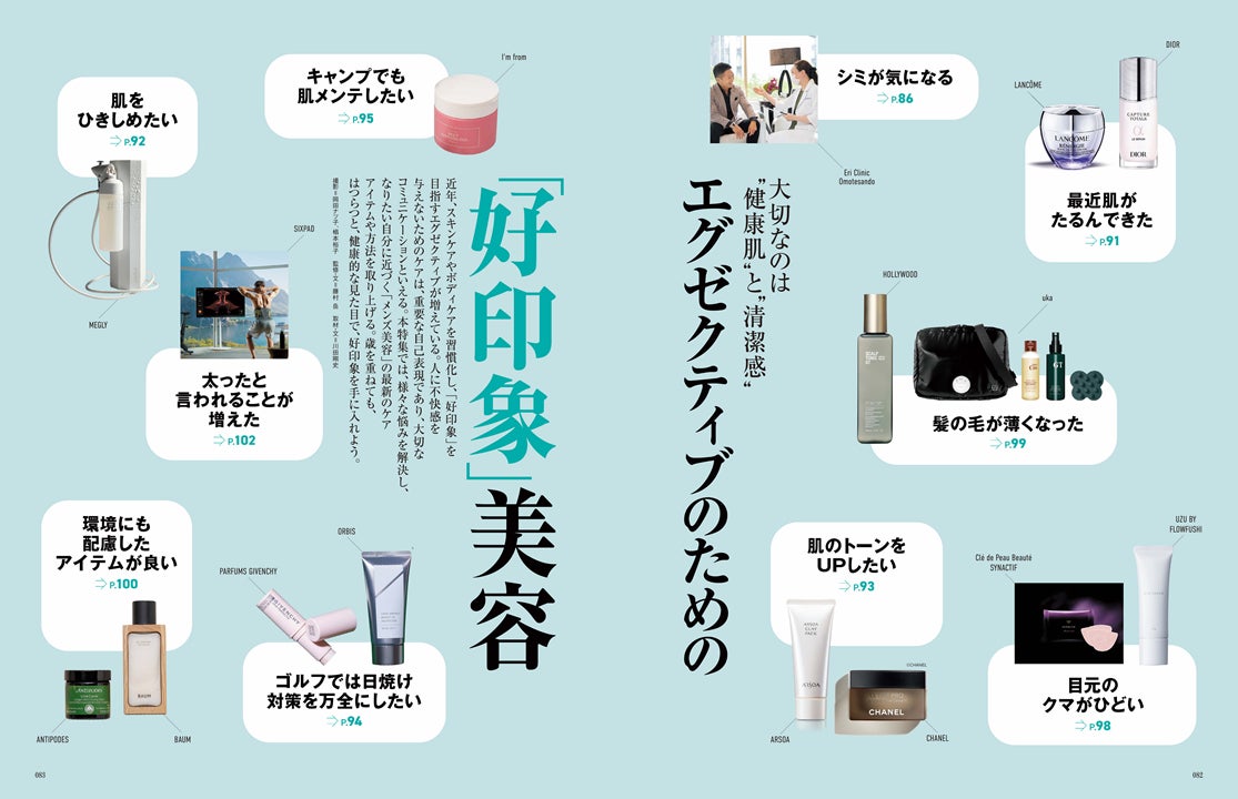 近年、スキンケアやボディケアを習慣化し、「好印象」を目指すエグゼクティブが増えています。人に不快感を与えないためのケアは、重要な自己表現であり、大切なコミュニケーションといえます。本特集では、様々な悩みを解決し、なりたい自分に近づく「メンズ美容」の最新のケアアイテムや方法を取り上げます。歳を重ねても、はつらつと、健康的な見た目で、好印象を手に入れましょう。