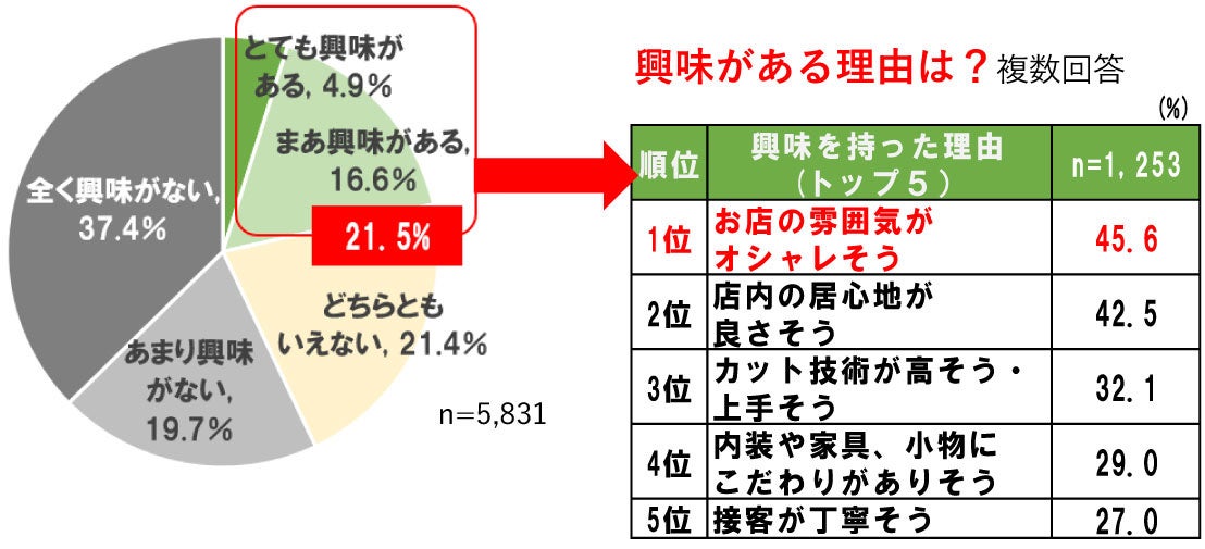 【「バーバー」利用に関する意識・実態調査】「バーバー」に興味を持つ理由の1位は「お店の雰囲気がオシャレそう」「眉カット」「トリートメント」の利用率は、美容室の3倍!