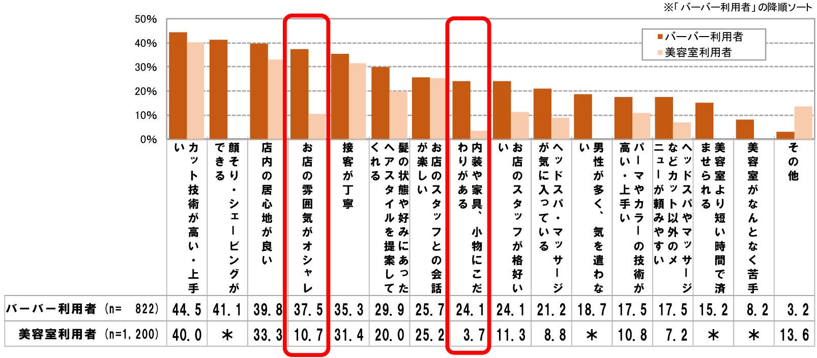 全般にバーバーの割合が高くなっているが、「お店の雰囲気がオシャレ」「内装や家具、小物にこだわりがある」で美容室との差が特に大きくなっている。