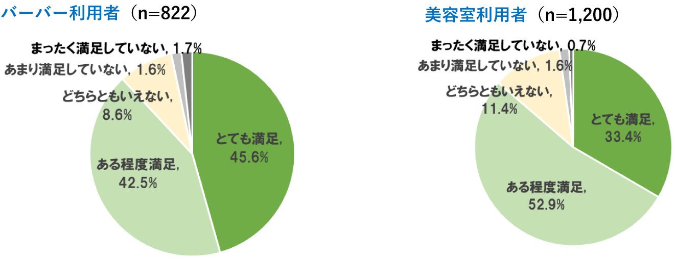 バーバーに「とても満足している」利用者は45.6%と半数近く。美容室(33.4%)の満足者割合より10ポイント以上高い。