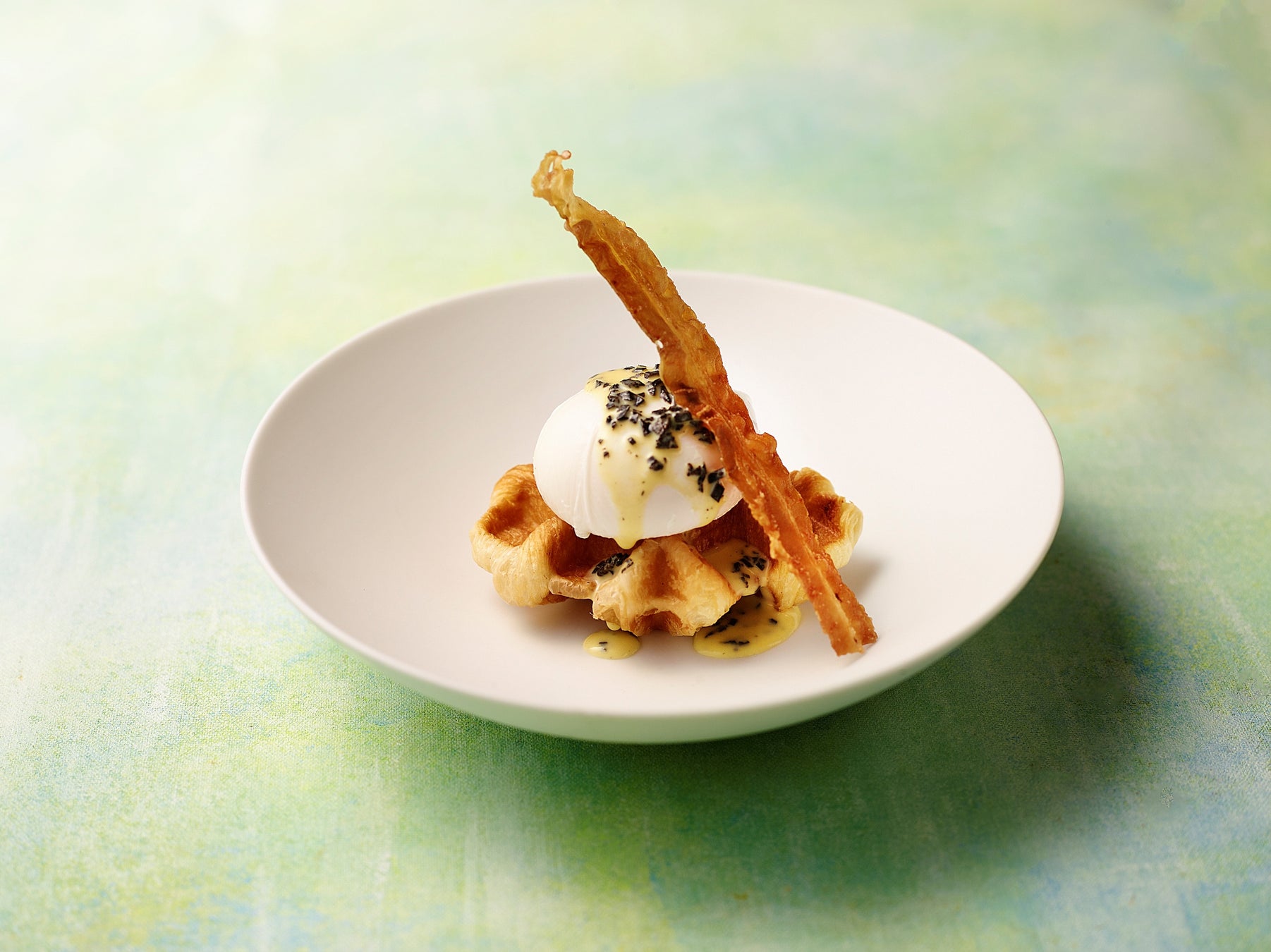 “クロッフル”にポーチドエッグ風の卵を乗せ、トリュフソースとクリスピーベーコンで香り豊かに仕上げました。濃厚な卵の旨味にベーコンの塩気がアクセントになった新食感をお楽しみください。
