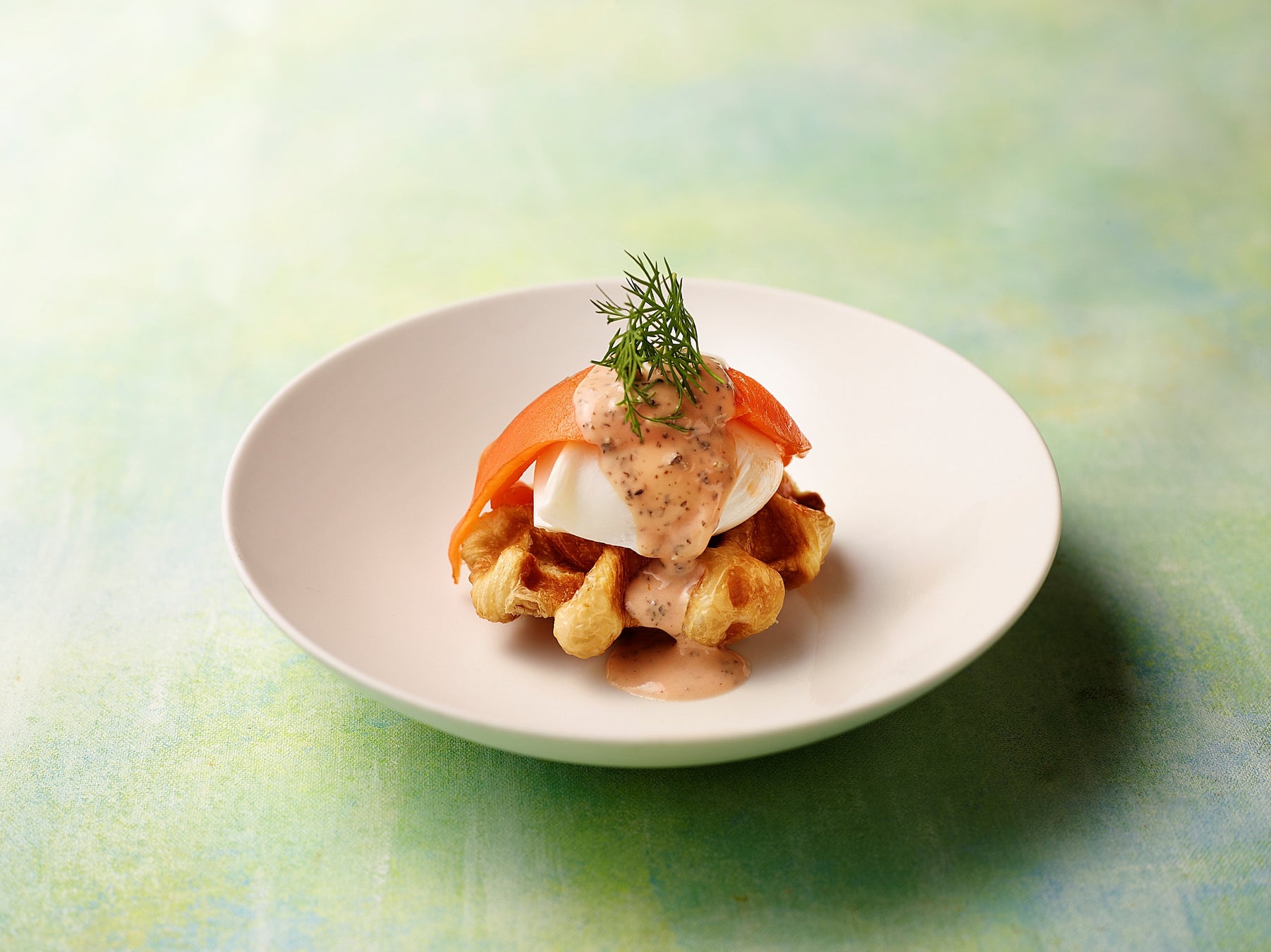 “クロッフル”にポーチドエッグ風の卵とスモークサーモンを乗せ、赤紫蘇風味のソースで仕上げました。付け合わせのディルと赤紫蘇の風味がサーモンのうま味を引き立て、卵のまろやかさが口いっぱいに広がる一品です。
