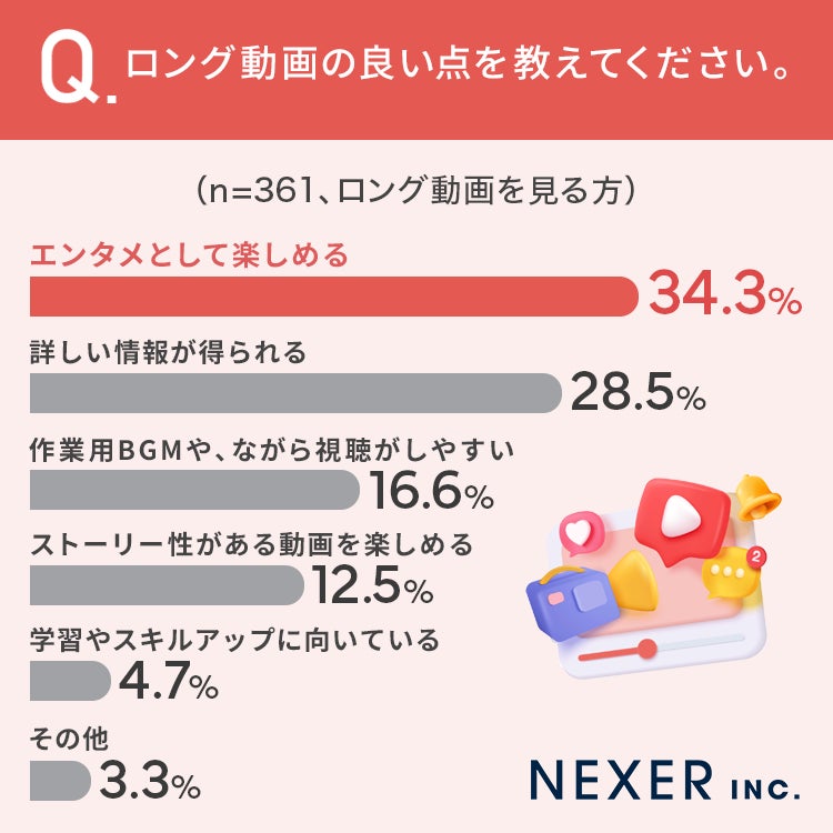 ロング動画の良い点について、34.3%を占める「エンタメとして楽しめる」と回答した理由を、詳しく見ていきましょう。