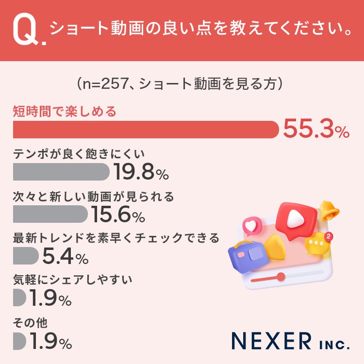 ■55.3%が、「ショート動画の良い点は短時間で楽しめる」と回答
