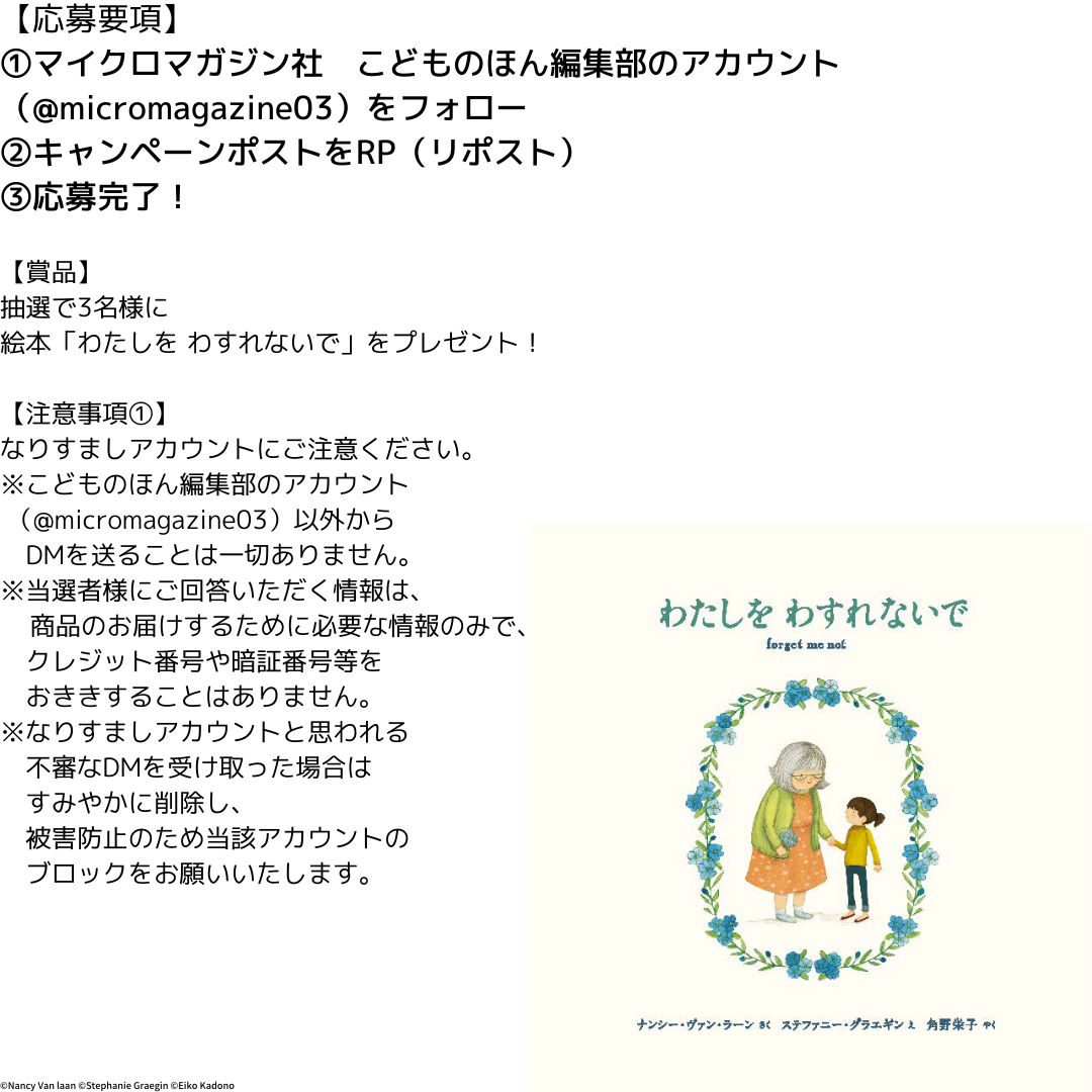 マイクロマガジン社(東京都中央区)は、読書週間「こどもの読書応援キャンペーン」として、児童書文学作家・角野栄子先生が翻訳した絵本『わたしを わすれないで』が抽選で当たるキャンペーンを開催いたします。