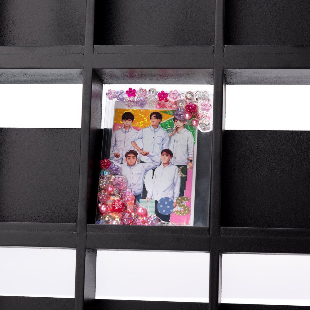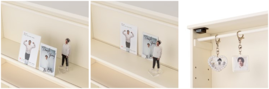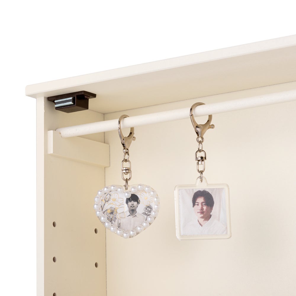 棚板には細い溝があり、トレーディングカードやチェキ・ポストカードを飾ることができます。また棚板の溝は前後どちらでも設置できる仕様。カードを前にして飾っても、奥にカードを飾って手前にアクスタなどを飾ることもできます。最上段にはキーホルダーやブレスレットを吊るして飾れるバーを設置しました。可動棚は3cmピッチで動かすことができるので飾るものに合わせて簡単に変えることができます。正面はアクリル扉。