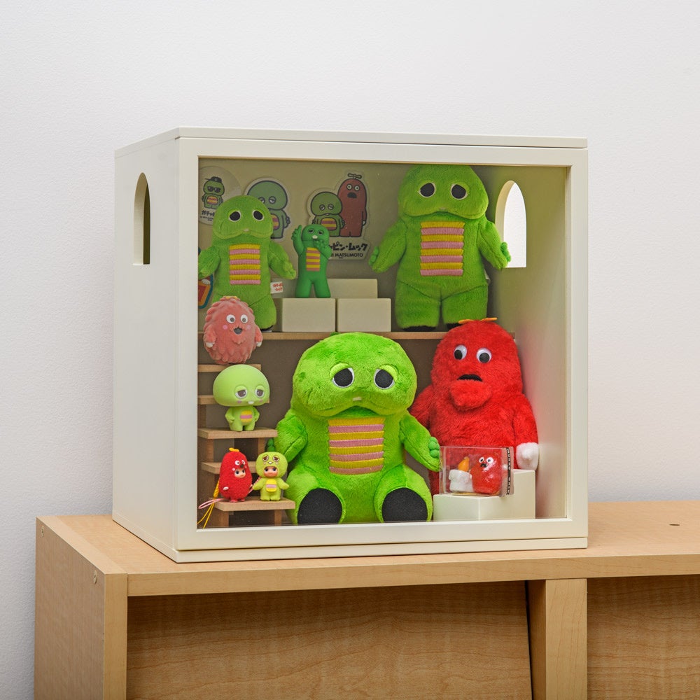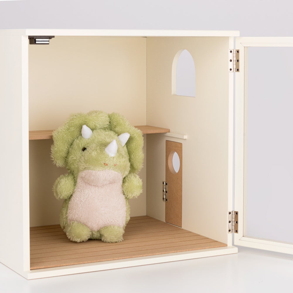 2階建てになっているので、手前に高さの高いぬいぐるみやアクリルスタンドを設置しても後ろのものが隠れることがありません。正面からはもちろん、窓からも中を見ることができるので“推し”をいろんな角度から楽しむことができます。ドアは開閉でき、推しのお出かけや帰宅を再現することができます。正面はアクリル扉で中に収納している大切なグッズを傷や汚れから守ります。
