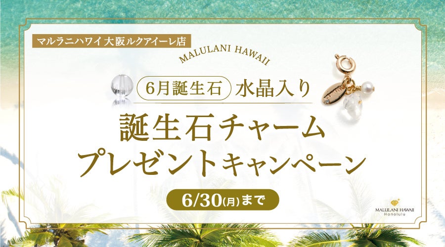 ハワイ発祥の天然石アクセサリーブランド「マルラニハワイ」ルクアイーレ店では、6月にお誕生日を迎えられる方で税込11,000円以上ご購入いただいたお客様へ、誕生石を使用した特別なノベルティチャームのプレゼントキャンペーンを実施いたします。