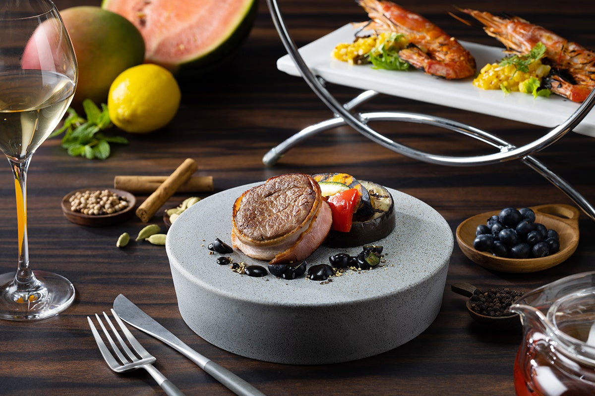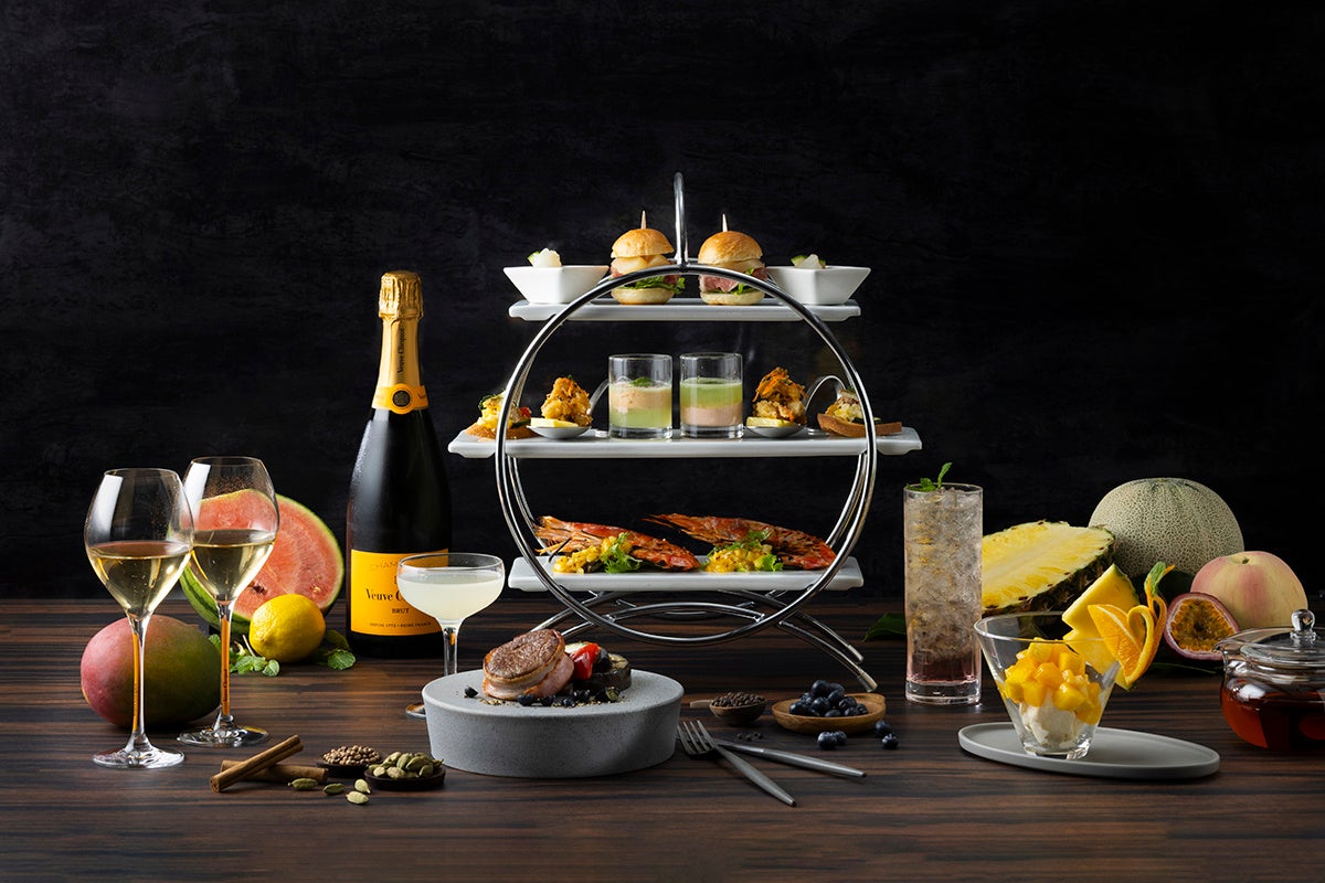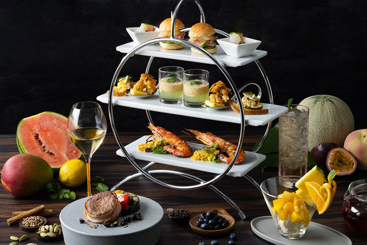 今夏は、白桃やすいか、マンゴーなどのフルーツと、ミントやエストラゴン、カルダモンなど清涼感あるハーブやスパイスを組み合わせた、セイボリーとデザートをお届けいたします。スタンドには、スパイスでマリネした明石蛸とマンゴーをはじめ、大阪産「能勢黒若牛」のローストビーフと白桃のコンポートを挟んだ、コリアンダーの香りがアクセントのスライダーバーガーなど、趣向を凝らした全5種の前菜をご用意。魚料理には、数種のスパイスを振りかけて焼き上げた有頭海老を、爽やかな塩レモンと甘酸っぱいパッションフルーツ、コクのあるマヨネーズをベースにしたソースとともにご提供いたします。肉料理には、ベーコンを巻いた国産牛フィレ肉をブラックペッパーのスパイシーな刺激とブルーベリーのほのかな甘酸っぱさでご堪能いただけます。デザートには、滑らかなヨーグルトダンジュに、トロピカルフルーツを添え、カルダモンとシナモンの甘く深みのある香りが印象的なパフェをお楽しみください。フリーフローのドリンクには、清涼感あふれるシャンパン、ヴーヴ・クリコをはじめ、7種のオリジナルカクテルと3種のノンアルコールカクテル、10種の香り高い紅茶をご用意いたします。