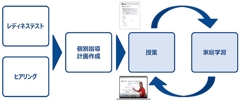「ひらスタ」では、生徒一人ひとりの学習状況に沿った学習を実現するために、期初テスト(レディネステスト)を実施し、その正答状況と聞き取り(ヒアリング)での把握結果も踏まえながら個別の学習指導計画を作成した上で、学習支援を開始します。
