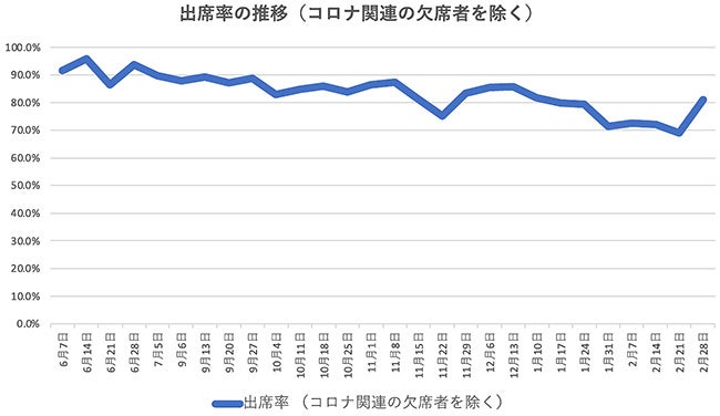 2021年5月から2022年2月の生徒の出席率は、平均8割超と、学校行事や部活動・受験といったやむを得ない欠席に加え、コロナ禍による自粛・心理的な通塾控えもあったことを踏まえれば、高い水準と言えそうです。