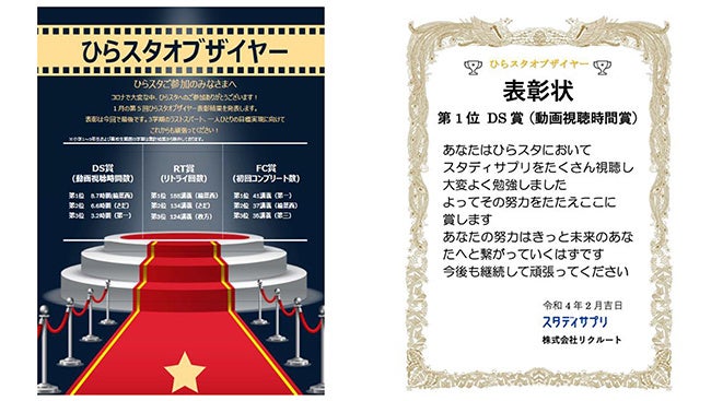 テストの点数といった「結果」だけではなく、講義動画の視聴や間違えた問題のやり直しといった、理解につながる学習行動「プロセス」を賞賛することを目的に、「講義動画の視聴時間」「間違えた問題のやり直し」等の学習行動でがんばった生徒を、月次で表彰しました。