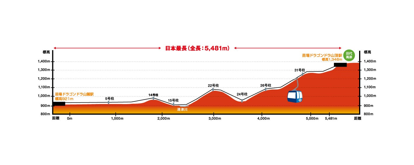 日本最長5,481mの長さを誇る「苗場ドラゴンドラ」は片道約25分の線路でアップダウンを繰り返し、スリルを体感していただけます。