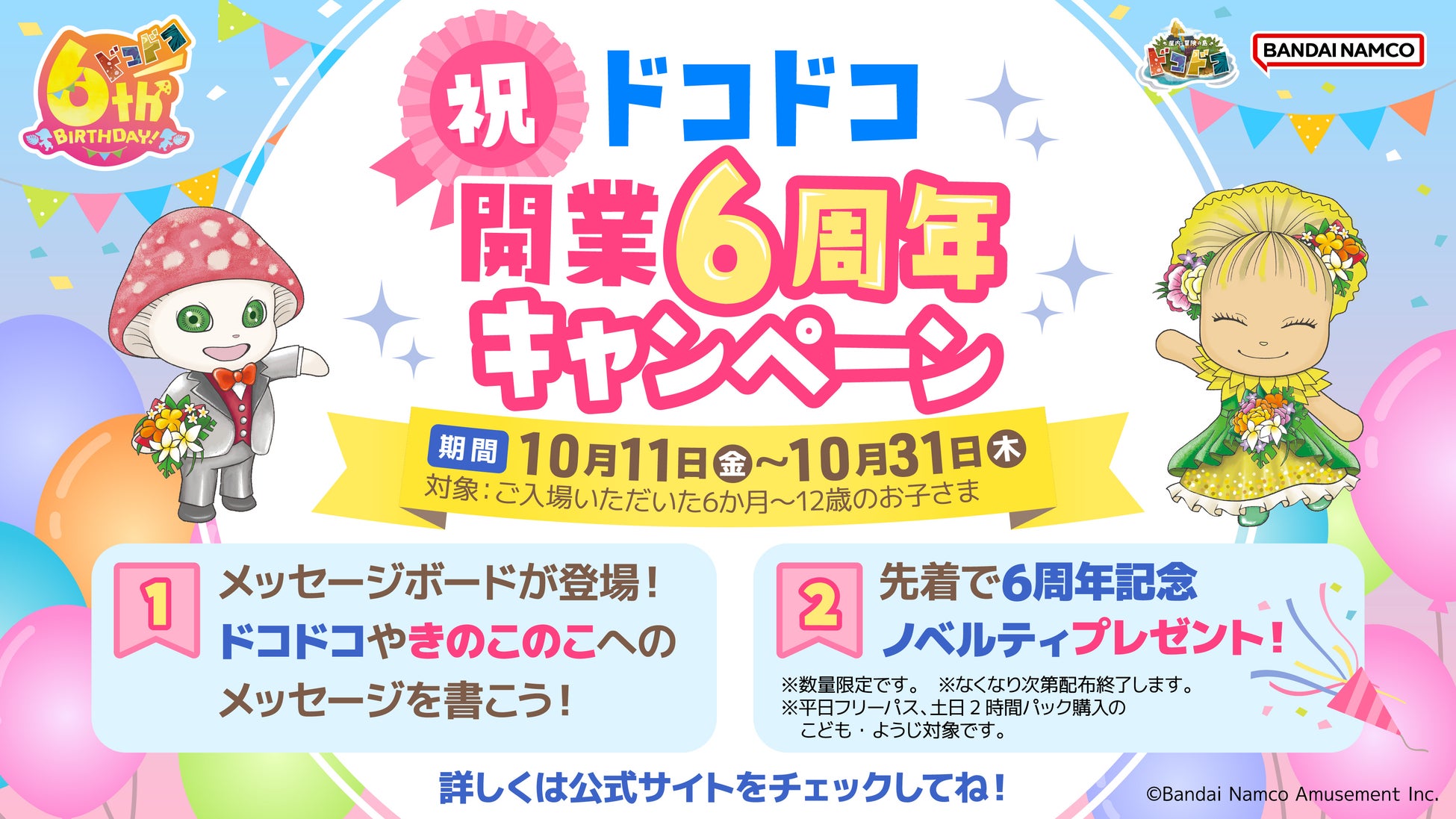 株式会社バンダイナムコアミューズメントが運営する『屋内・冒険の島 ドコドコ』(東京都立川市)が2024年10月に6周年を迎えることを記念して、10月11日(金)~10月31日(木)の間『祝!ドコドコ開業6周年キャンペーン』を開催します。