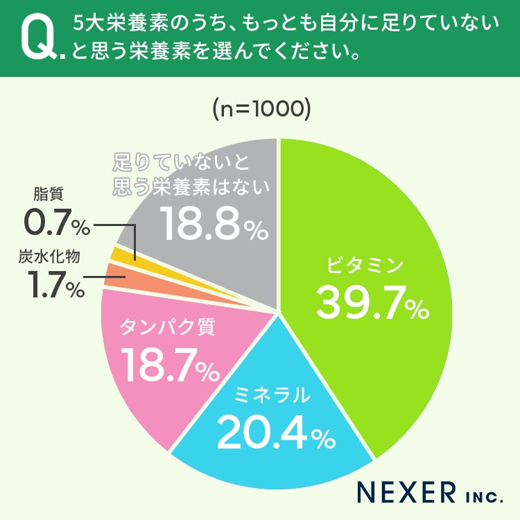 39.7%の方が、5大栄養素のうち「ビタミンがもっとも足りていないと思う」と回答しています。