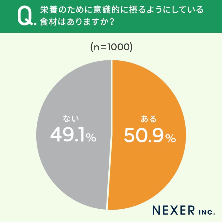 50.9%と半数以上の方が、栄養のために意識的に摂るようにしている食材が「ある」と回答しています。