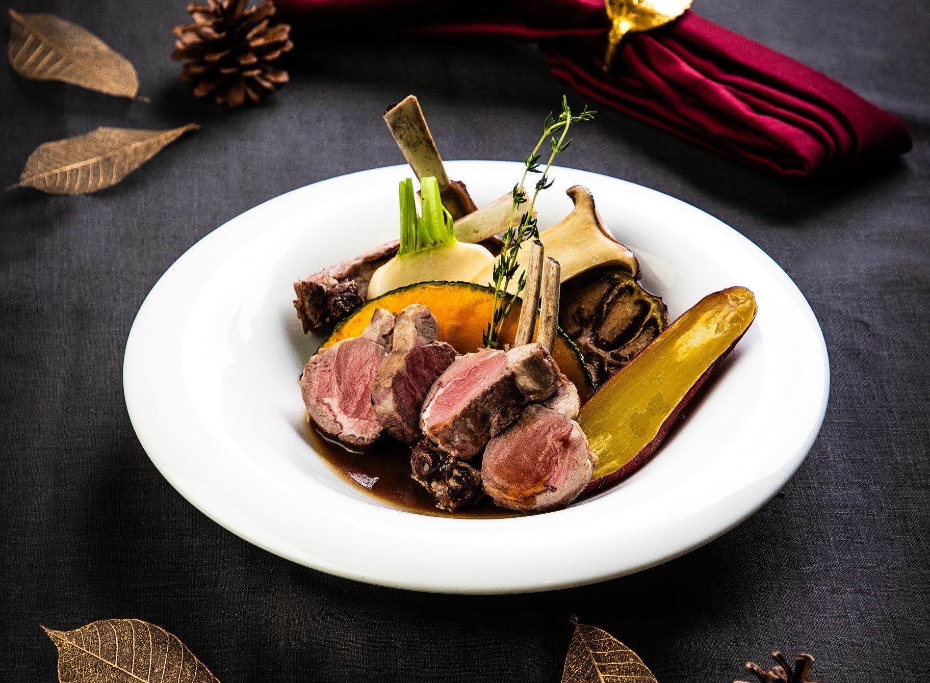 アミノ酸豊富な仔羊肉と旬の秋野菜を、栄養がたっぷり摂れる『蒸し煮』でご用意。