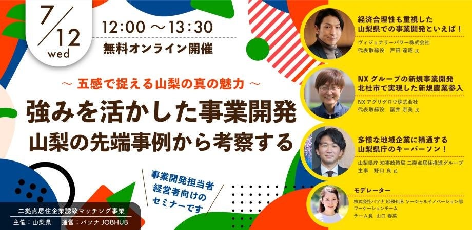 パソナJOB HUB 山梨県への企業移転等を支援セミナー『強みを活かした事業開発 山梨の先端事例から考察する』7月12日開催