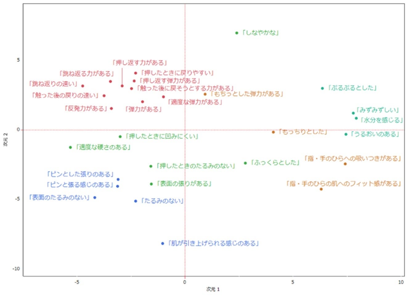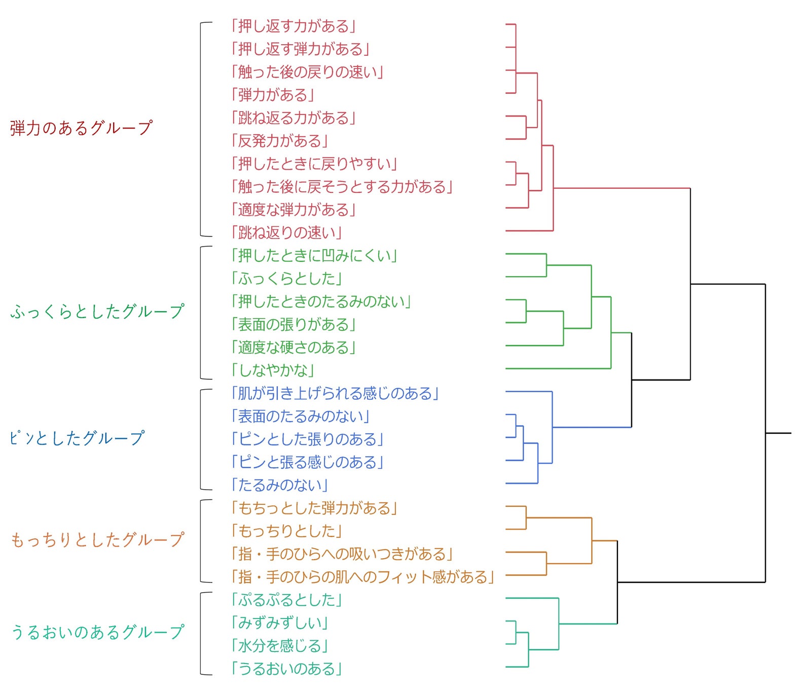 最初に、肌のハリ感を形容する表現を社内アンケートとインタビューにより約100語集め、「化粧品使用後のハリ感を表す言葉として適切か」を起点に、その中から代表的な29語を選定しました。それらの言葉の意味の近さを分析したところ、「ハリ感」は以下の5つのグループに整理できることが分かりました(階層的クラスター分析(1)使用:図1)。