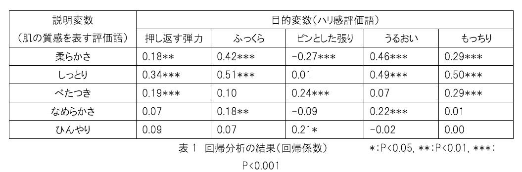 最後に、「ハリ感の違いが、具体的にどのような肌の質感と結び付いているのか」を調べました。官能評価試験で得られたスコアを回帰分析(3)した結果(表1)、以下が得られました。