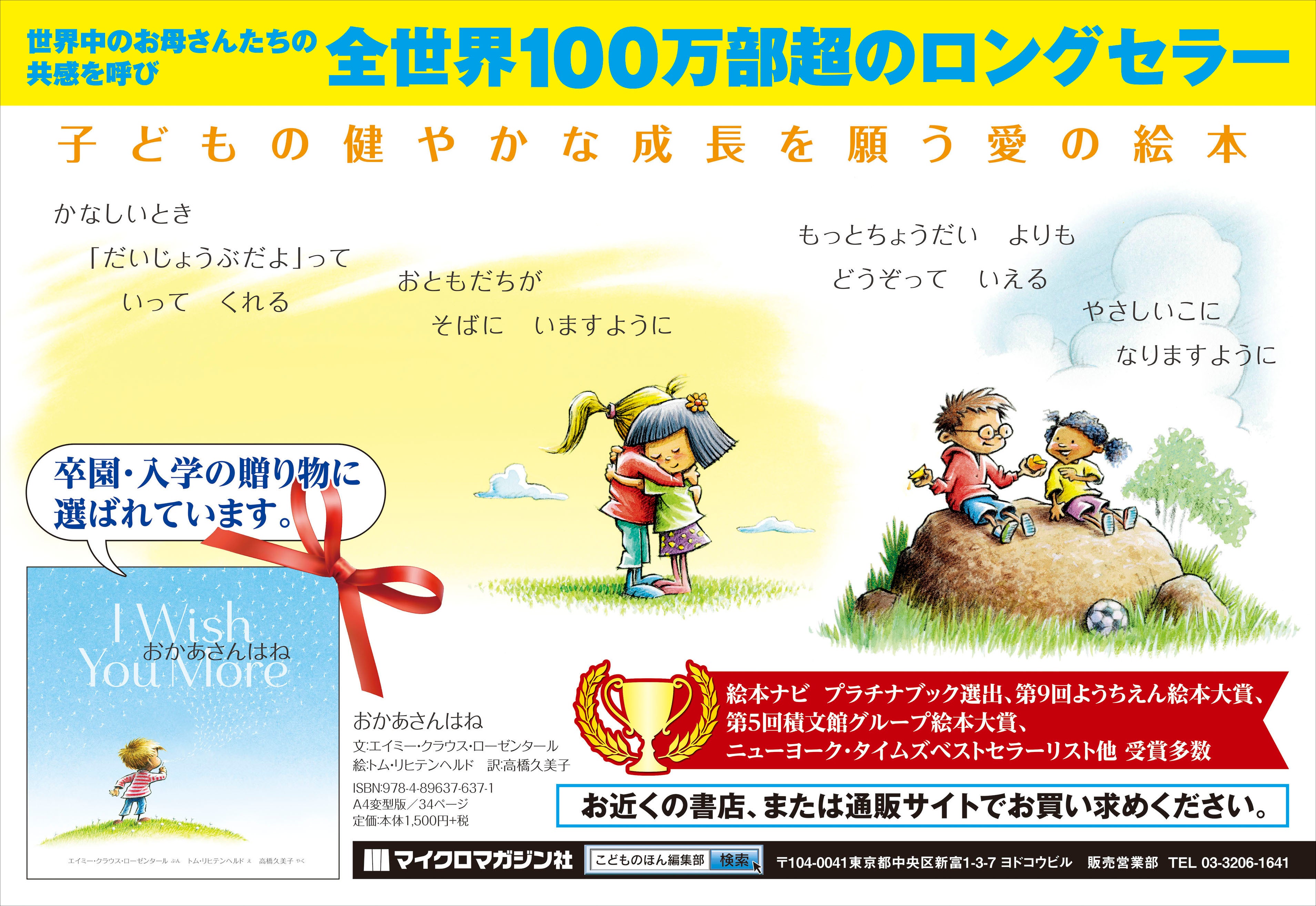 世界中のお母さんたちの共感を呼び全世界150万部超のロングセラー絵本『おかあさんはね』第9回ようちえん絵本大賞、第5回積⽂館グループ絵本⼤賞、こどものための100冊選出!中日新聞・北陸中日新聞に掲載