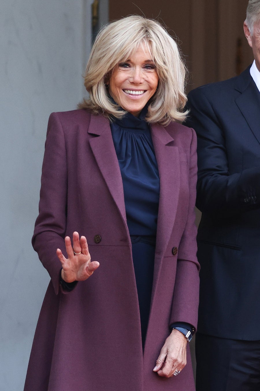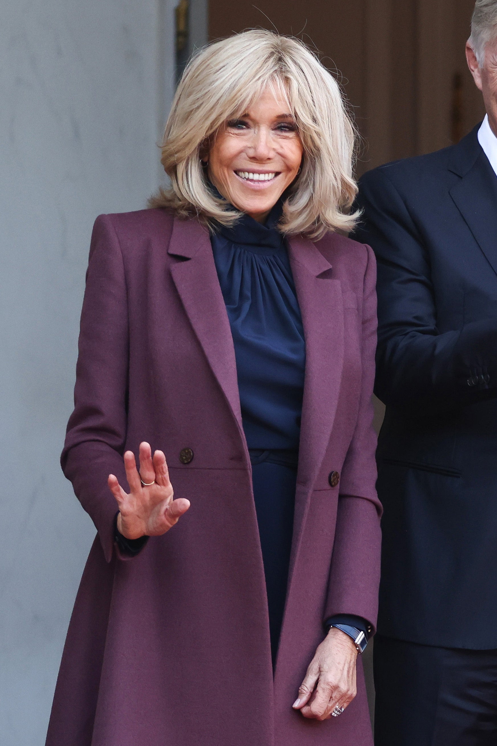 ブリジット·マクロン仏大統領夫人は、ワインカラーのカシミアダブルブレストコートに、ネイビーのハイネックシルククレープデシンのドレスを着用しました。