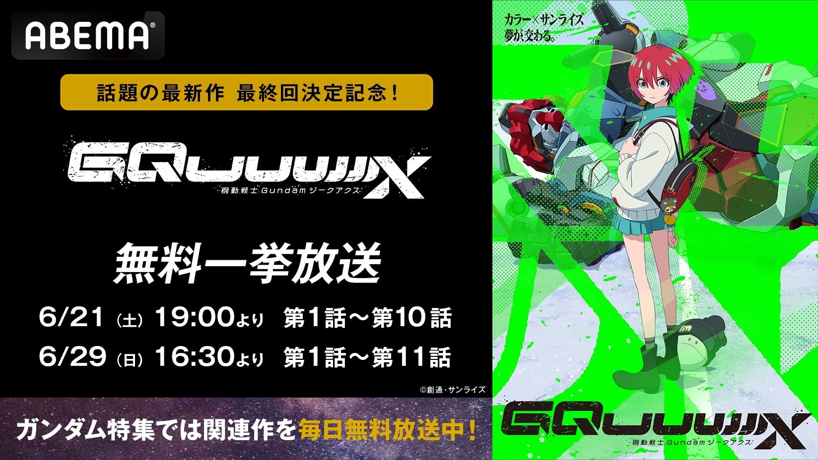 このたび「ABEMA」にて実施が決定した、『機動戦士Gundam GQuuuuuuX(ジークアクス)』の2週連続無料一挙放送では、6月29日(日)のABEMAでの最終話放送に向け、6月21日(土)、22日(日)と翌週6月28日(土)、29日(日)に最新話まで全話を無料一挙放送いたします。また放送後1週間の全話無料配信も実施いたします。