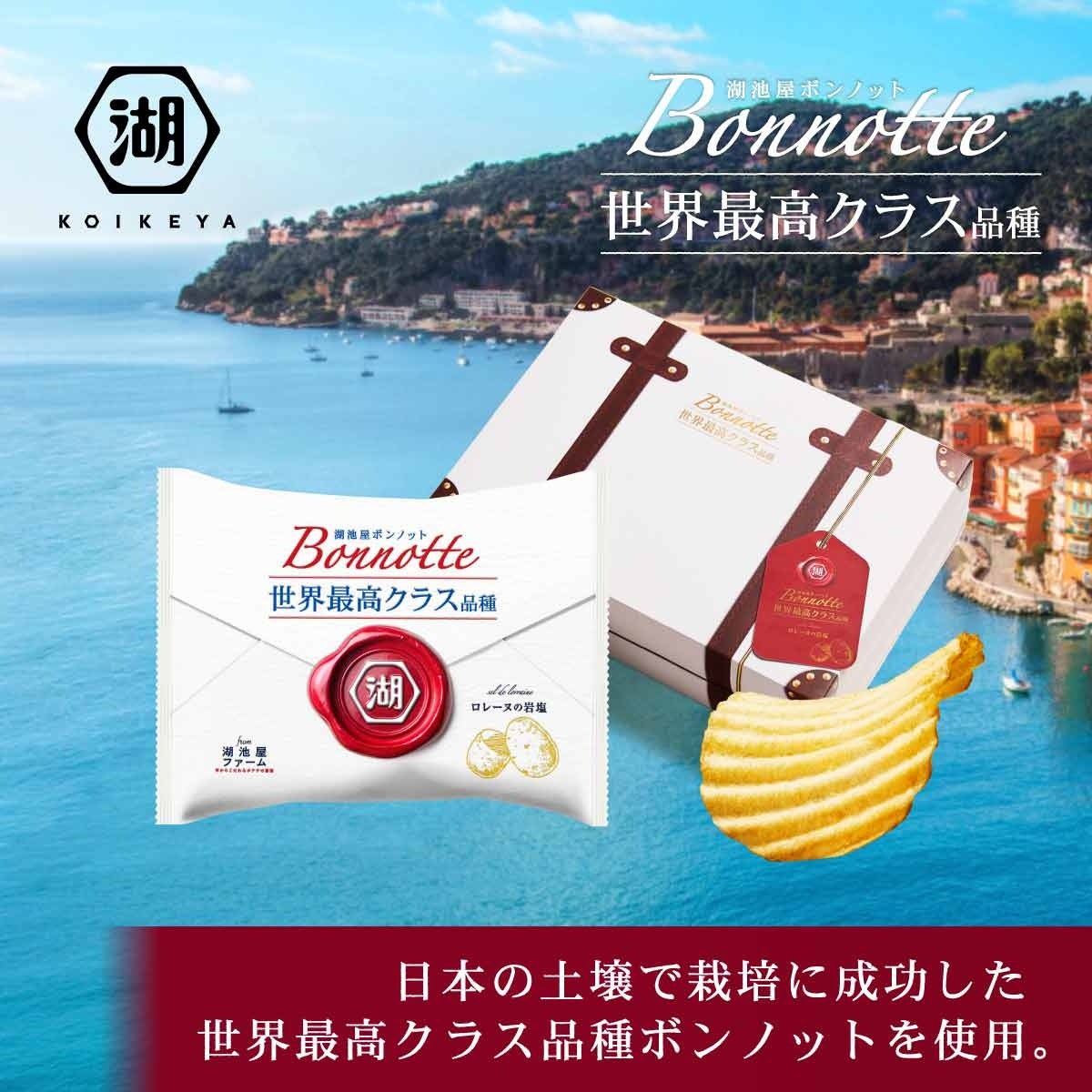 本商品には、日本の土壌で育てられた、強い旨味とほのかな塩味を感じられるじゃがいも「湖池屋ボンノット」を使用。その味わいをお楽しみいただけるよう、フランス ロレーヌの岩塩を使用して仕上げました。