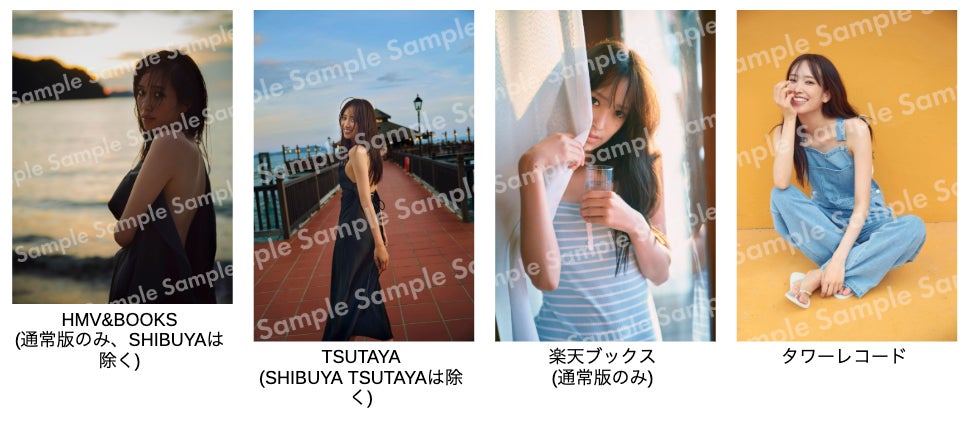 今回の書店別購入特典は、折り目なしB3ポスター4種とポストカード11種。マレーシア・ランカウイ島でのびのびと卒業旅行を楽しむくみてんと東京で撮影した写真集未掲載カットを採用。折り目なしB3ポスターの特典がついてくる店舗は、HMV&BOOKS SHIBUYA、SHIBUYA TSUTAYA、セブンネットショッピング、星野書店 近鉄パッセ店の4店舗。ポストカードは、HMV&BOOKS(通常版のみ、SHIBUYAは除く)、TSUTAYA(SHIBUYA TSUTAYAは除く)、楽天ブックス(通常版のみ)、タワーレコード、コーチャンフォー、紀伊國屋書店(通常版のみ、店舗のみ)、未来屋書店、くまざわ書店、丸善ジュンク堂書店、三省堂書店、DONUTS BOOKSの11店舗となります。