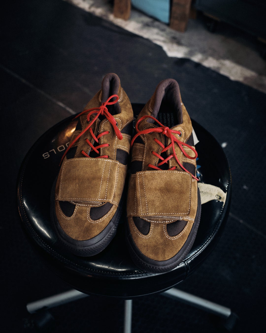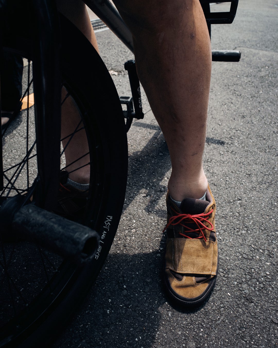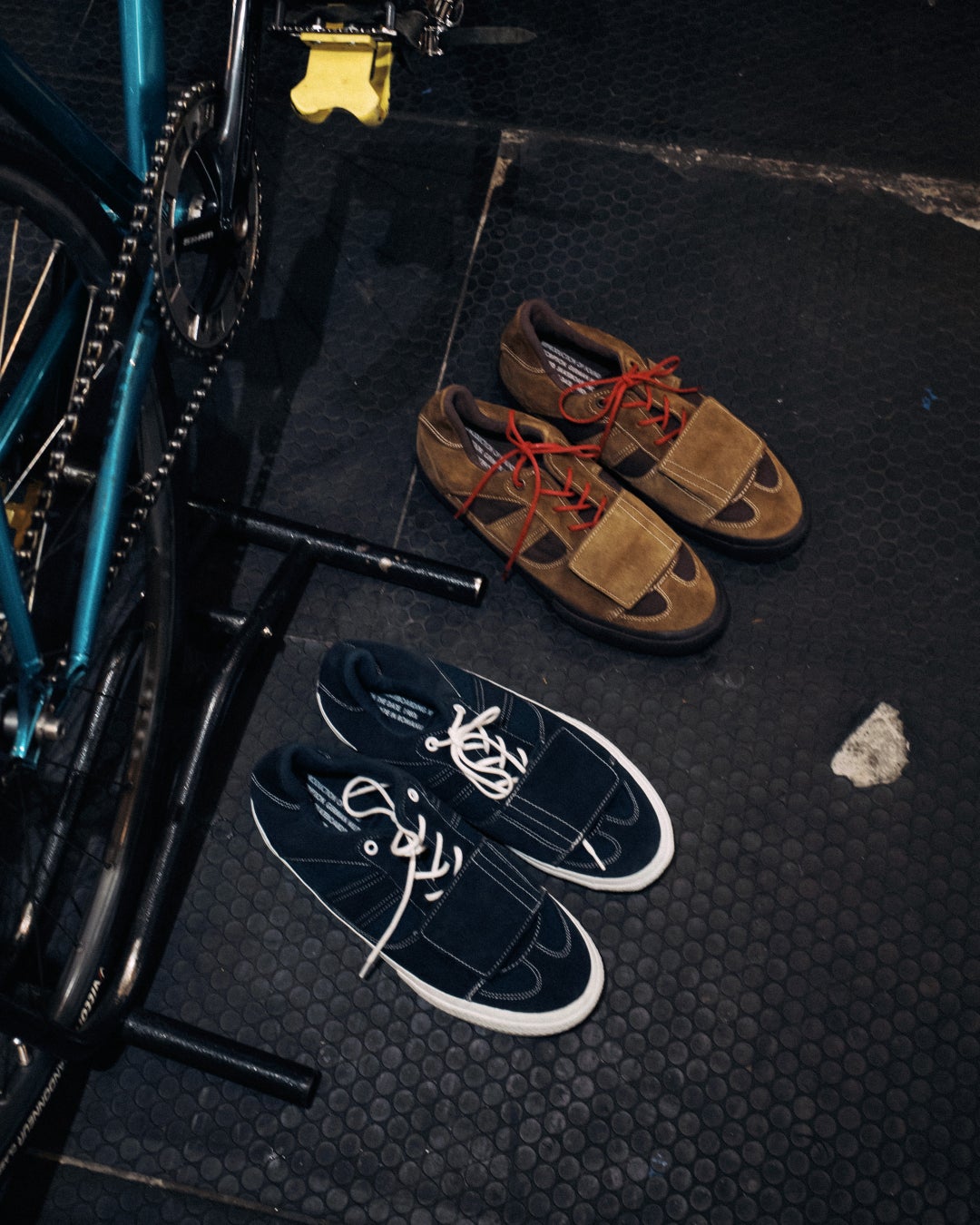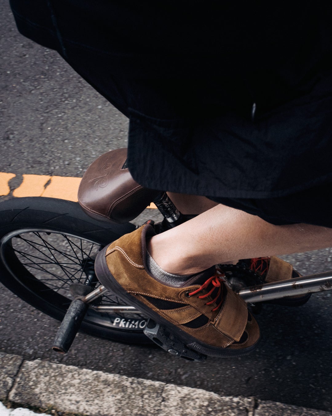 特徴的なディテールはベルクロのストラップ。このディテールを見てピンと来る方も多いだろう。シューレースを守り、自転車に乗る時にはチェーンに絡みにくい。