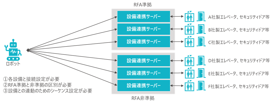 「RoboticBase」とエレべータやセキュリティドア、ゲート、電子錠等の各設備との連携は、RFA※1に準拠したIFによってその品質が保証されています。また、RFAに準拠していない設備とも「RoboticBase」を介して接続が可能ですので、ロボットメーカとしては、設備側のIF仕様を意識することなく連携が可能になります。