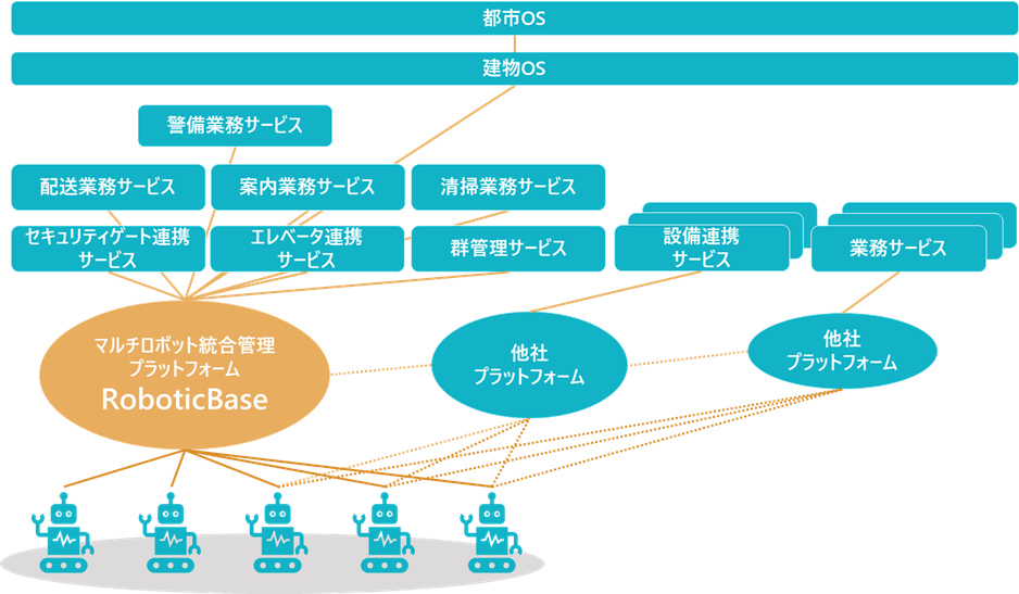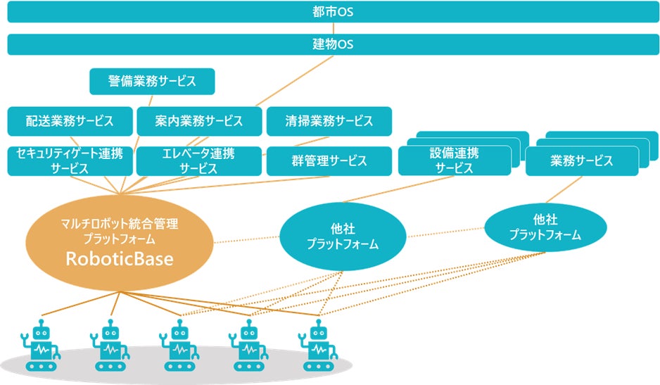 異なるプラットフォームでも、相互接続が可能になります。「RoboticBase」は、各サービスプラットフォームの連携ハブとして機能します。これにより各ロボットメーカは、従来個々の接続に必要だった時間とコストを削減でき、より容易に導入が可能になります。
