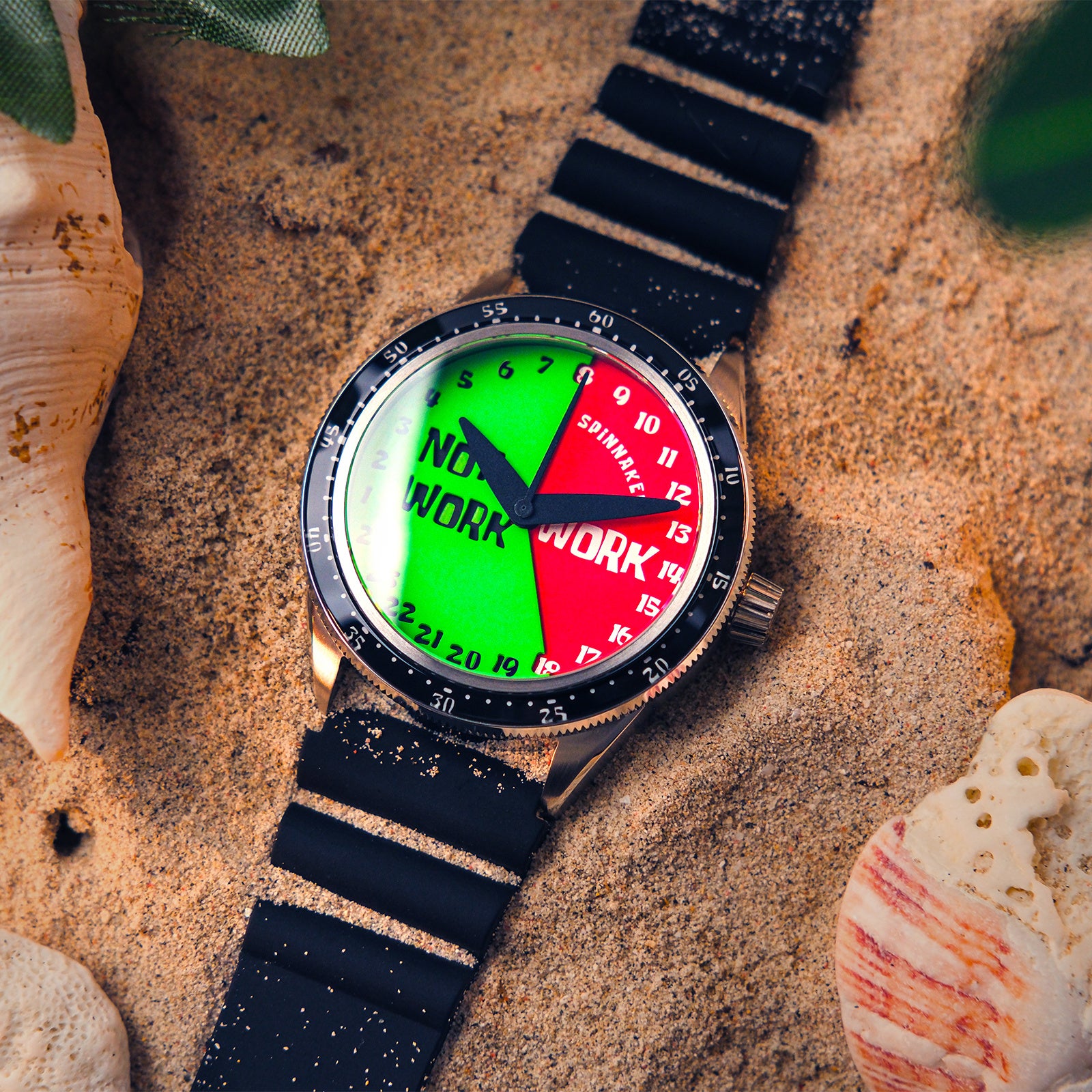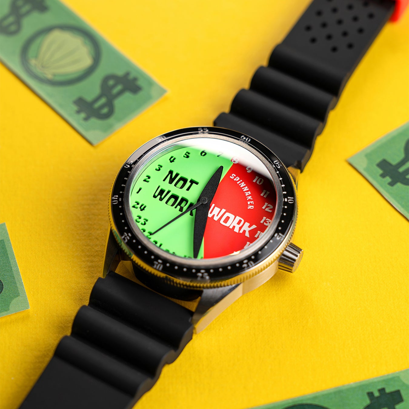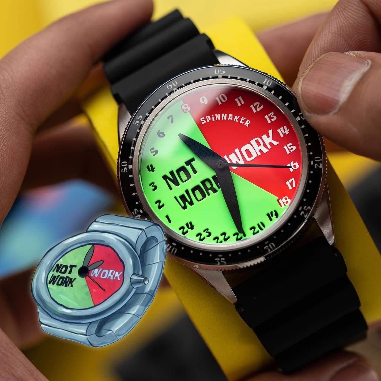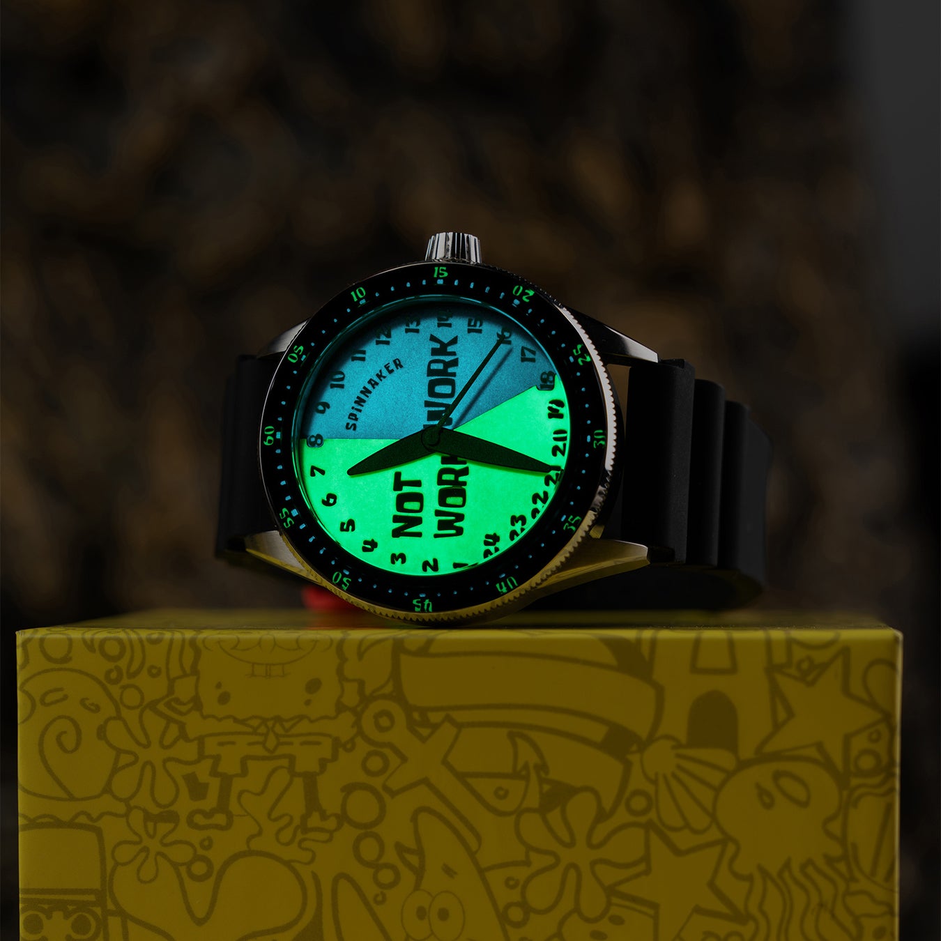 スポンジ・ボブが着用する時計からインスピレーションを受けたのが、「ワーク・ノット・ワーク」です。そこにはスポンジ・ボブの時間に対する姿勢が示されています。つまり、「いつ働くべきか、 いつ働かないべきか」。物語の舞台である海底都市、ビキニタウンの人気バーガー店「カニカーニ」で働くスポンジ・ボブは、仕事に励む一方で時間管理も一人前です。時針は24時間で1回転する仕組みで、サンドイッチ構造の文字盤には「ワーク」と「ノット・ワーク」の時間帯が明確に表されています。