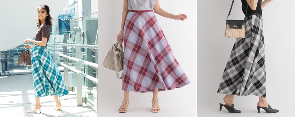 コーデを華やかにする主役スカートで、大判なチェック柄もナローシルエットで上品な印象に。