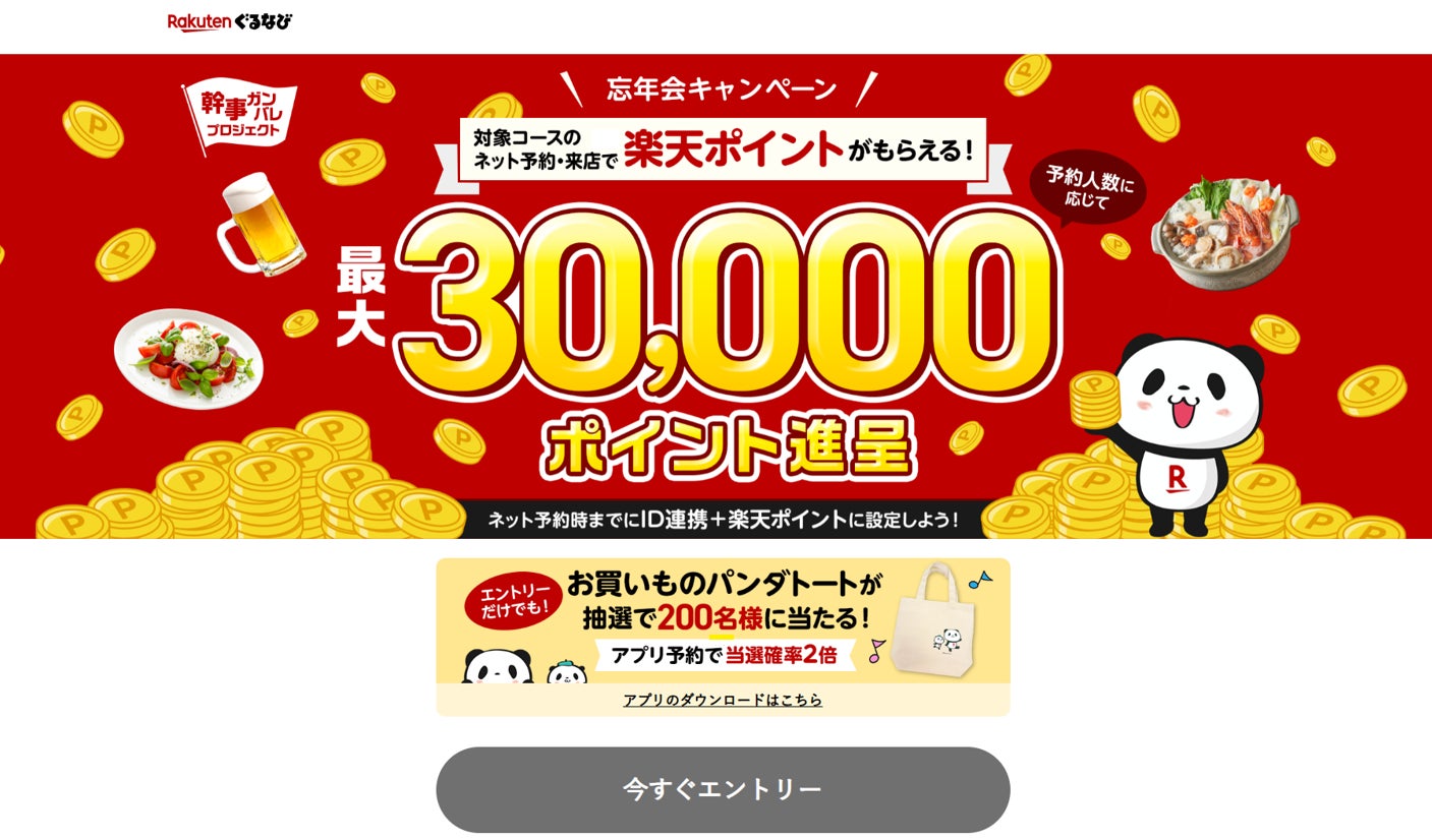 本キャンペーンでは、来店日時までにエントリーをして対象の飲食店でランチ1,500円以上、ディナー3,000円以上のコースを2名以上でネット予約・来店すると、ランチは人数×60ポイント、ディナーは人数×100ポイント、通常の予約来店ポイントと合わせて最大30,000ポイント(※1)の「楽天ポイント」を進呈します。さらに、期間中にエントリーした方の中から抽選で200名にオリジナルの「お買いものパンダトート」をプレゼントします。「特典1」の条件を満たす予約を「楽天ぐるなび」アプリでしていただいた方は、当選確率が2倍にアップします。
