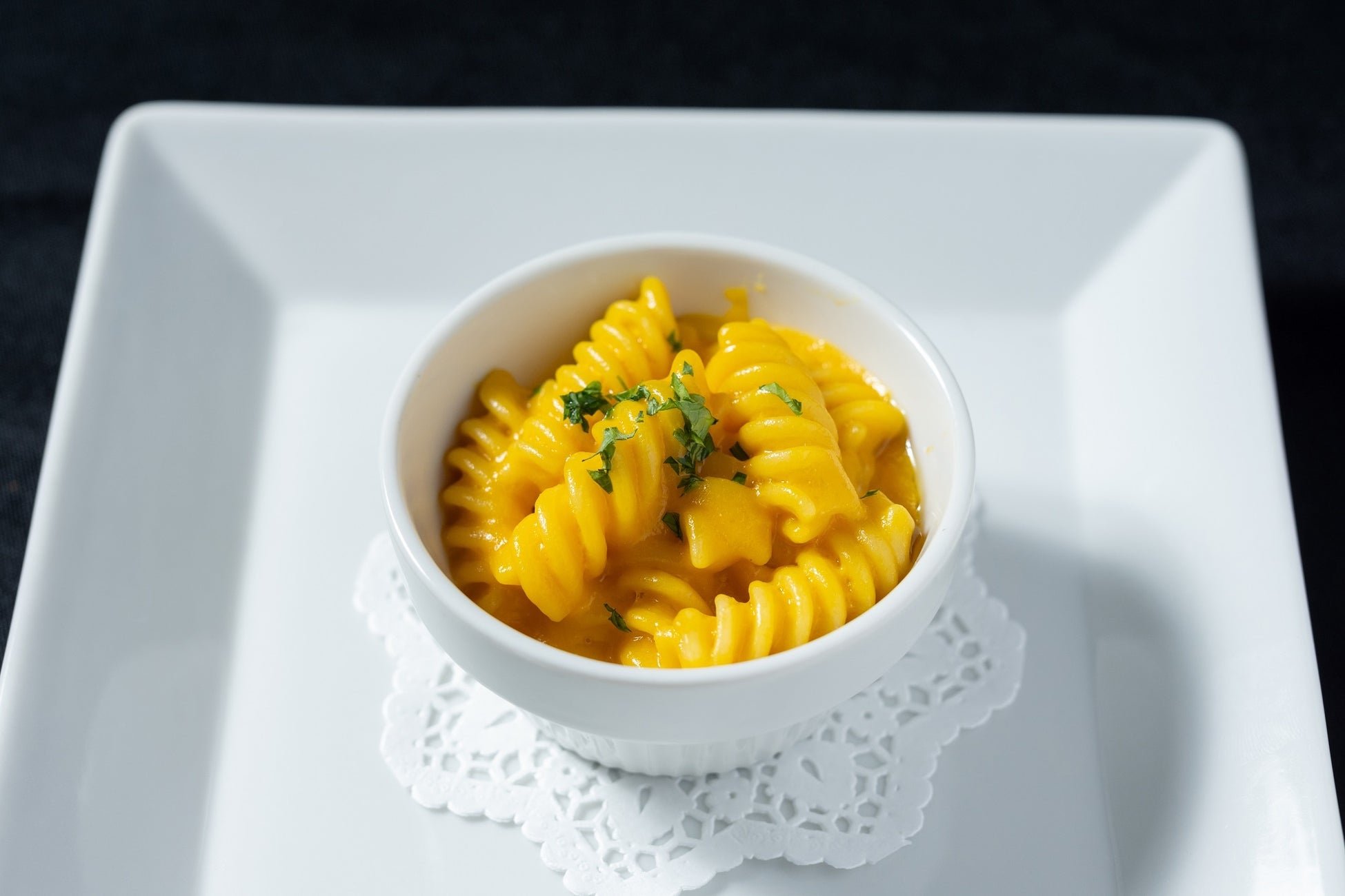 カボチャの旨味とチェダーチーズのコクを捻じれた形状のパスタ「フリッジ」に絡めたマカロニチーズ。