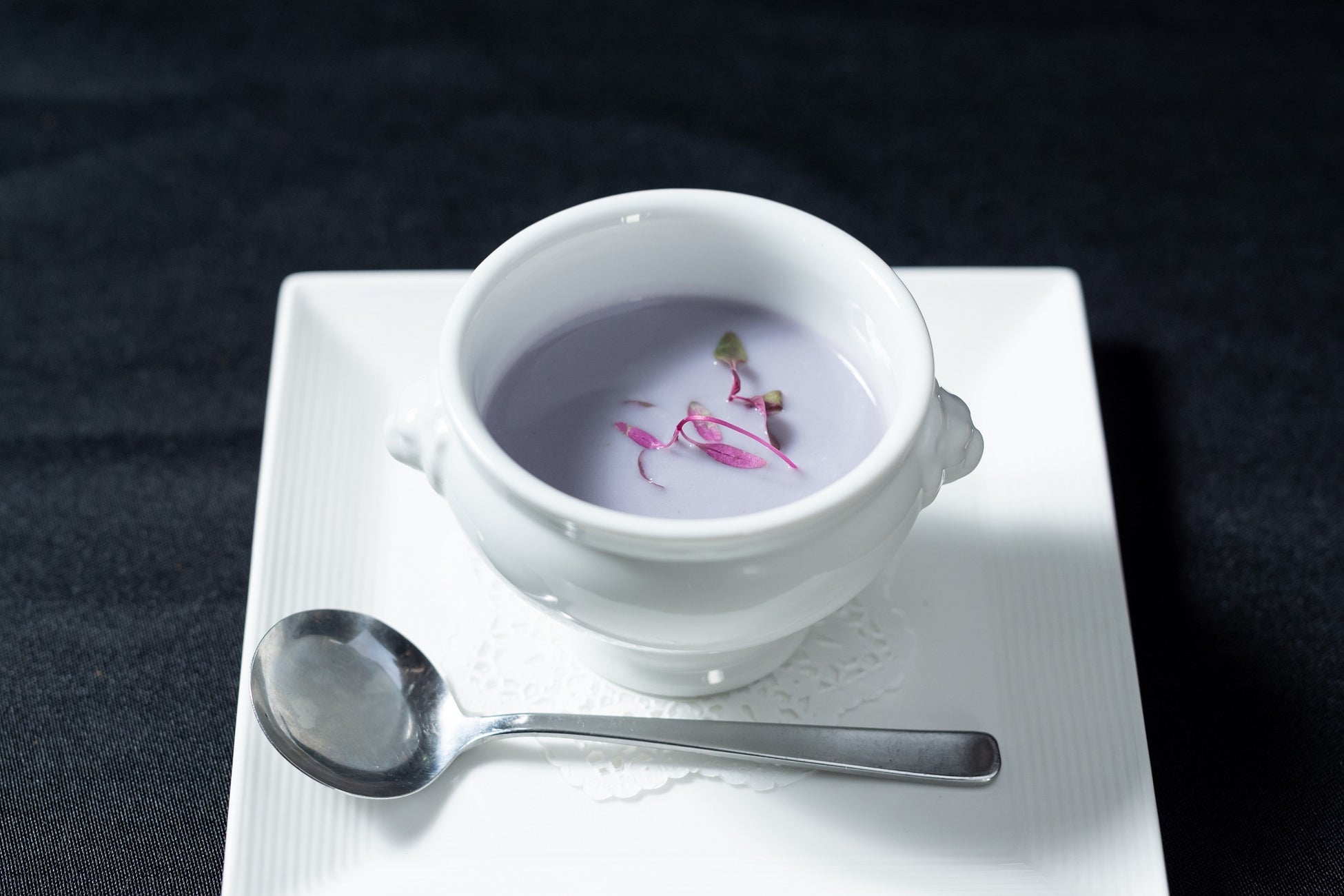 紫キャベツとジャガイモを合わせ、怪しい紫に仕上げたハロウィン仕様のポタージュ。