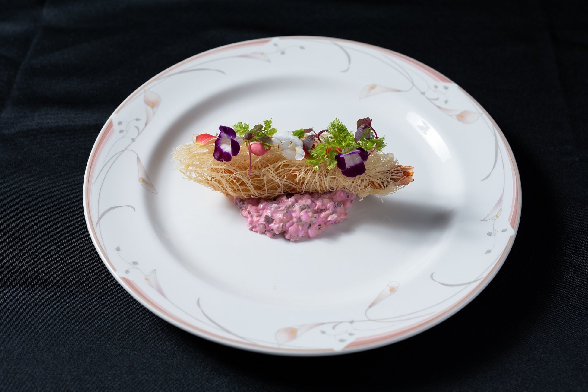 オマール海老の身を、トルコやギリシャに起源を持つ『天使の髪』と呼ばれる細い麺状の生地でミイラのように巻いて揚げ、華やかな花をあしらいました。タルタルソースは柴漬けの食感と酸味を活かし、紫色に仕上げております。