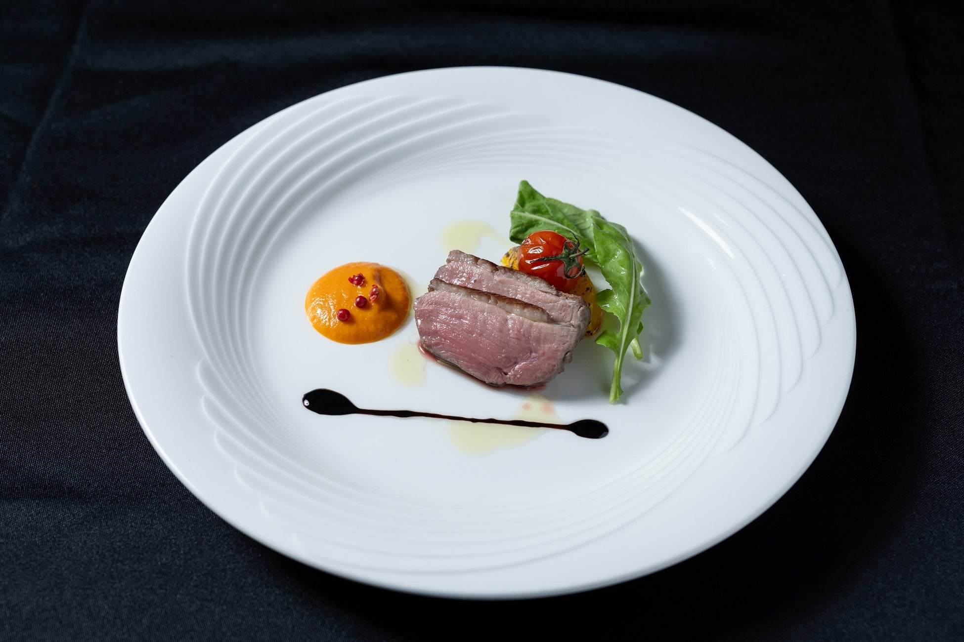 一晩、香草の香りと下味を染み込ませた鴨の胸肉を低温調理し、皮目をカリッと焼き上げました。ハロウィンカラーの2色のソースとして、黒はバルサミコソース、オレンジは赤・黄パプリカを使いデコレーションしております。