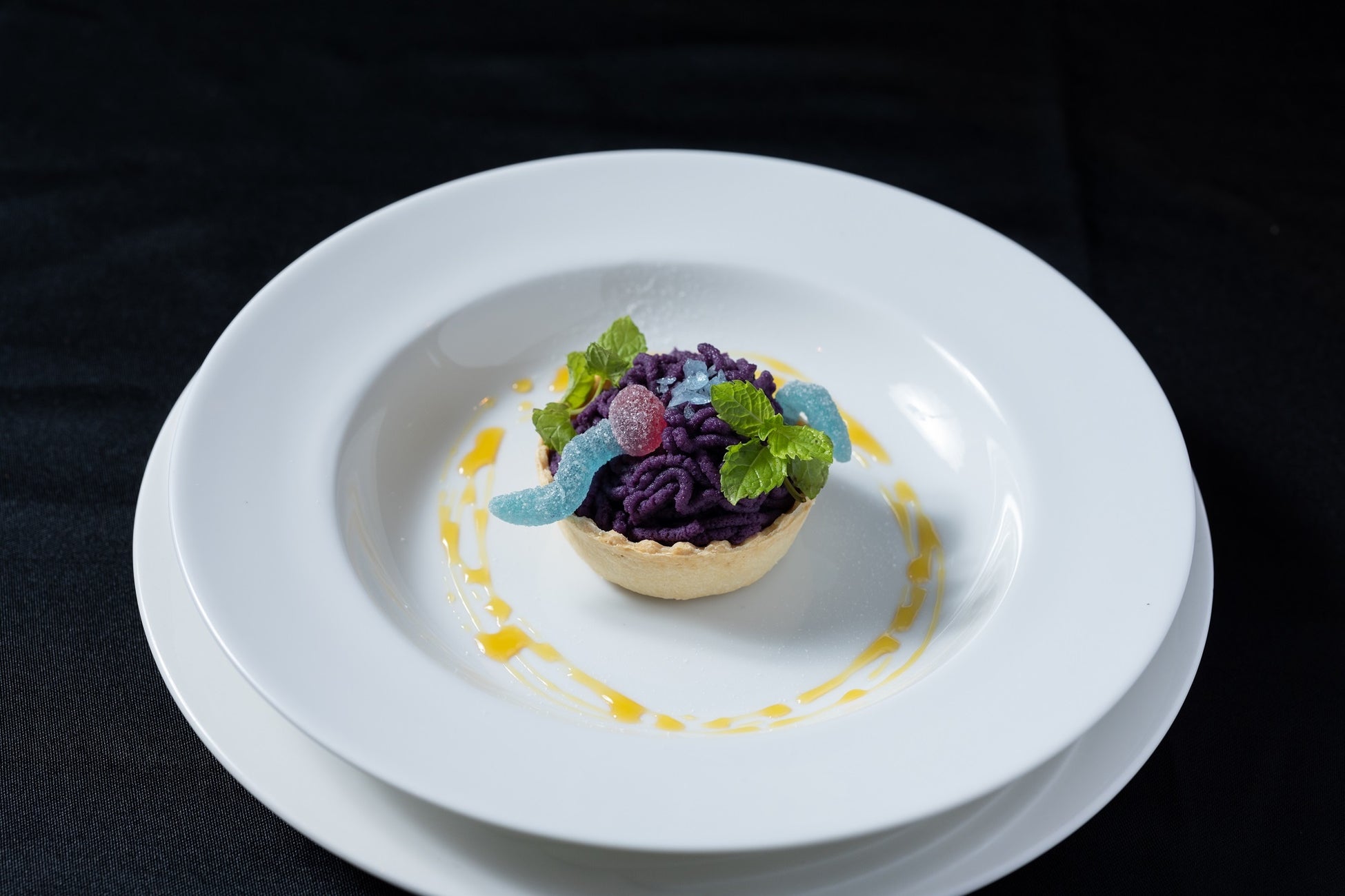 パリで人気のクスクスを使ったサラダ「タブレ」を、竹炭をつかい“闇のタブレ”として表現。デビルエッグのクリームはバタフライピーというハーブの青い色素をつかい、怪しげな色合いに仕上げました。ブラックオリーヴの蜘蛛をあしらい、今にも巣を張りそうな雰囲気を表現しております。