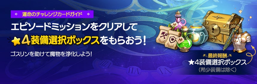 エピソード「運命のチャレンジカード」に関するミッションをクリアすることで、「高級魔毒兵器イオスパズルパック」や「ゴスリンチケット」などのアイテムを報酬として獲得することができます。また、全てのミッションをクリアすると最終報酬として「★4装備選択ボックス(希少装備は除く)」がもらえます。
