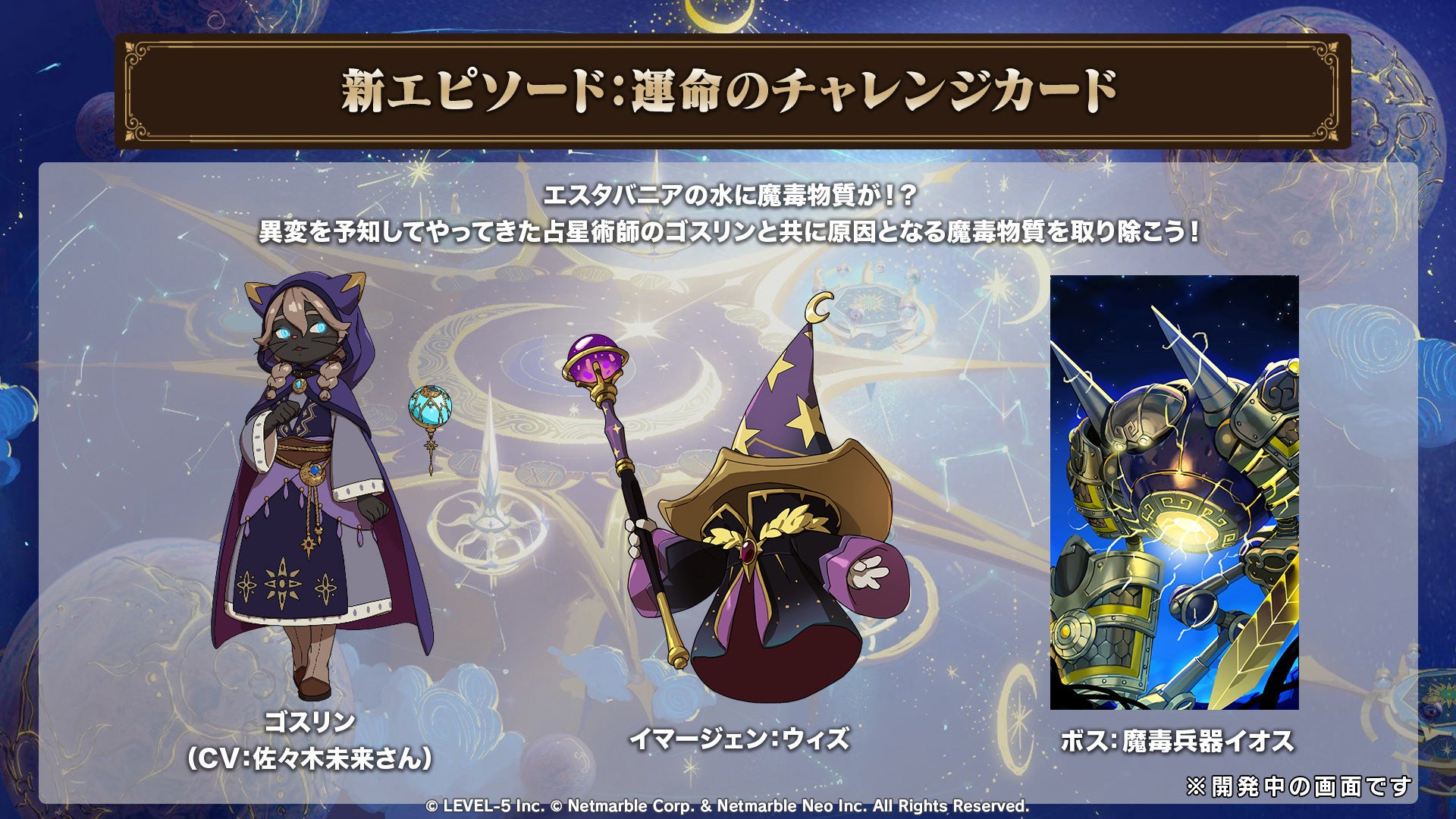 本アップデートより、「ニノクロ」世界の外伝ストーリーとなる新エピソード「運命のチャレンジカード」が登場いたします。本エピソードでは、異変を予知してやってきた占星術師「ゴスリン」と共にエスタバニアを救う物語(名声クエスト)に加え、エピソードダンジョンやエピソード遺物、エピソードパスなどのコンテンツをお楽しみいただけます。