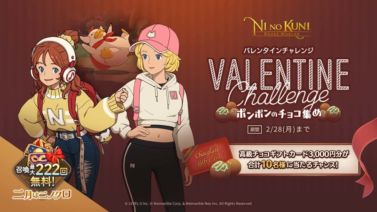『二ノ国:Cross Worlds』では、本日2月10日(木)より、抽選で3,000円分の高級チョコギフトカードが10名様に当たるWEBイベント「バレンタインチャレンジ:ポンポンのチョコ集め」を開催いたします。