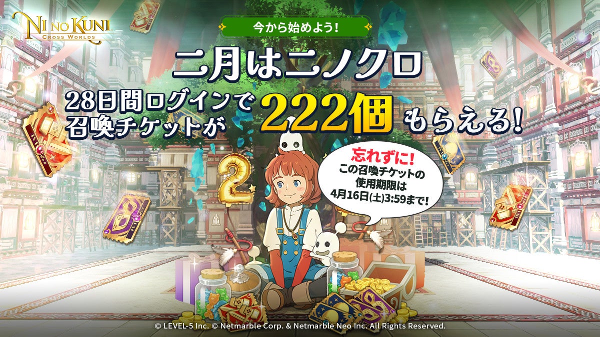 『二ノ国:Cross Worlds』では上記のイベント以外にも、2月中にゲームにログインすることで最大222個の召喚チケットが受け取れるイベントを開催している他、ログイン報酬の希少★4イマージェンをユーザー投票で決定するイベントの近日開催も予定しております。
