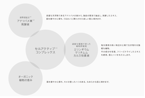 *整肌成分(サッカロミセス/アナツバメ巣発酵液、エリンギウムマリチムムカルス培養液、ツボクサエキスをはじめとするオーガニック成分などによる複合成分)