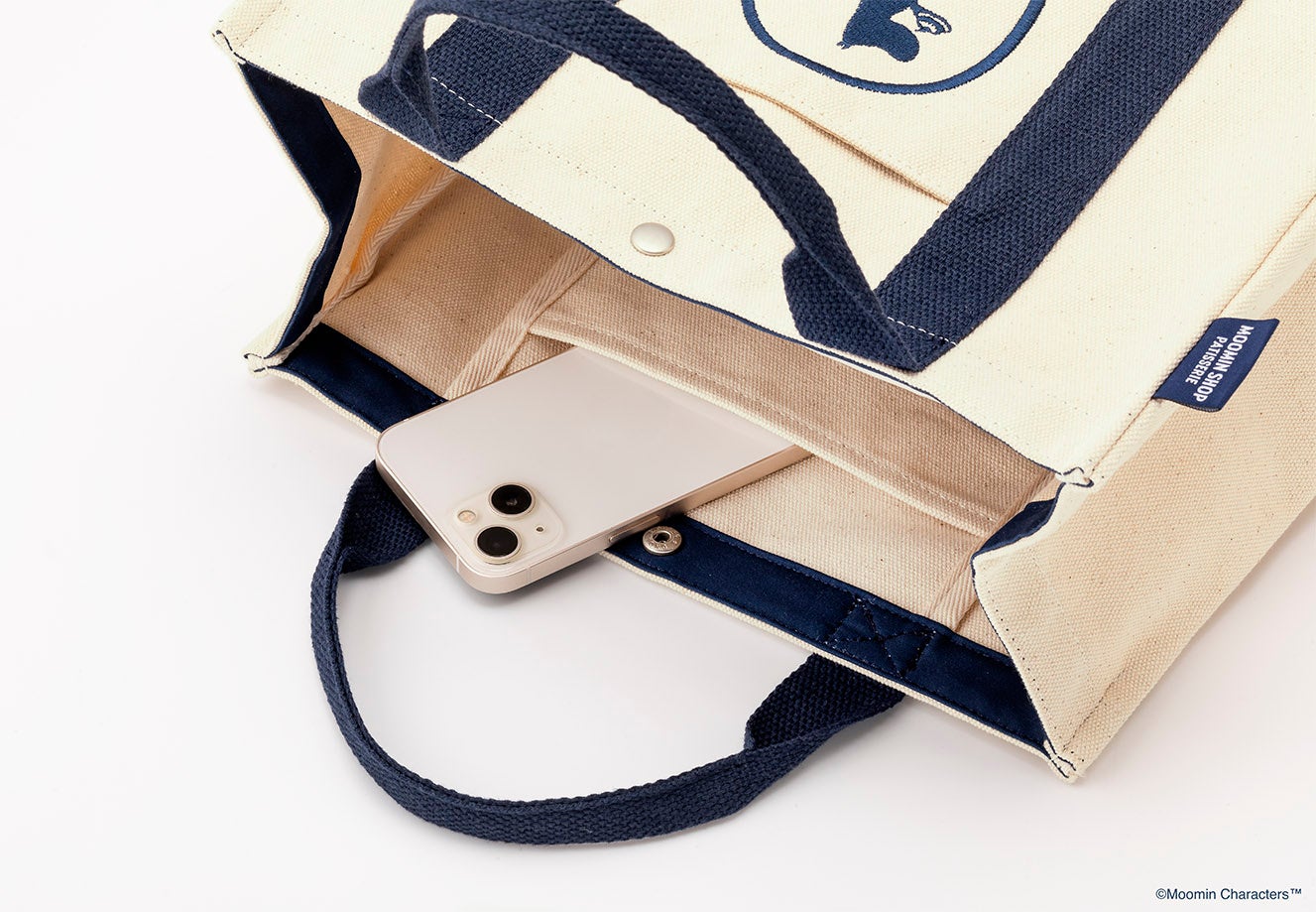 「ムーミンショップ パティスリー」のロゴがかわいい、キャンバス生地のトートバッグです。外ポケットから内ポケットまで付いて、マチも広いのでとっても機能的。ランチバッグとしても、ムーミンママのように大切なものを入れて持ち歩くのにもぴったりです。