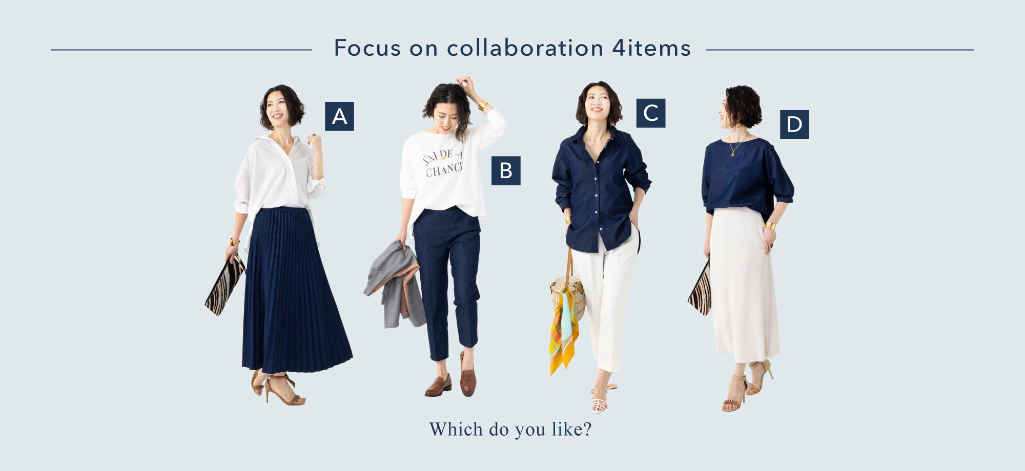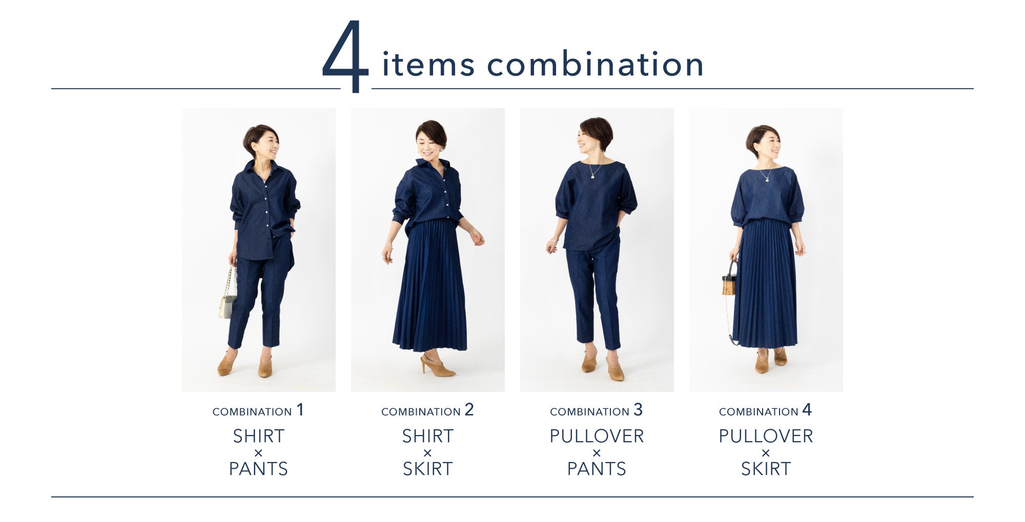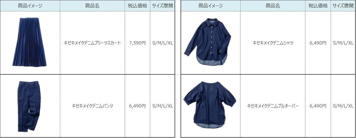 アイテムは、プリーツスカート・テーパードパンツ・シャツ・プルオーバーの、セットアップ着用も可能なデニム4アイテムをラインナップ。美しく広がる計算されたプリーツ幅で細見え・たっぷりの丈感が大人を格上げするスカート(税込¥7,590/画像A)、デニムパンツとはひと味違うきちんと見えを実現する、大人の為のテーパードパンツ(税込¥6,490/画像B)、ハリのあるデニムの生地感が大人らしい余裕のある立体フォルムを演出するシャツ(税込¥6,490/画像C)、ボリュームスリーブが女性らしく、着るだけで簡単に決まるプルオーバー(税込¥6,490/画像D)。サイズ展開もS~