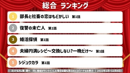 スマホ向けコミックサイト「マンガよもんが」にて連載し、累計ダウンロード数100万を突破している大人気マンガが原作の「部長と社畜の恋はもどかしい」が年間1位に輝きました。残業女子と、定時男子のラブコメディーで、最終回後にはSNSでも「続編が見たい」など皆様に愛されたドラマでした。総合ランキングではその他もドラマが上位を占めました。
